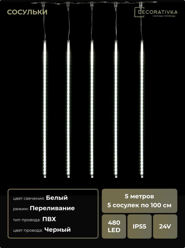 Гирлянда Тающие Сосульки 5шт по 100см, 24В, 480 Белых Светодиодов, Провод Черный ПВХ, IP55