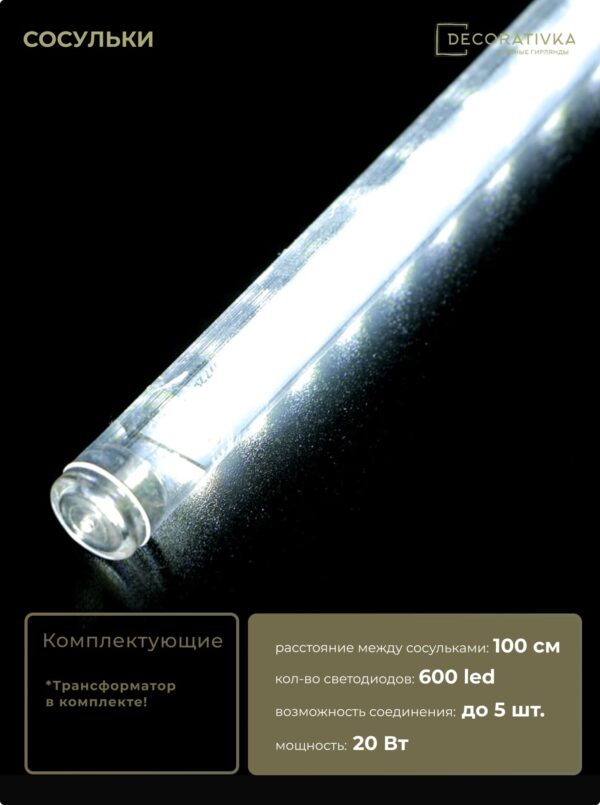 Гирлянда Тающие Сосульки 10шт по 50см, 24В, 600 Белых Светодиодов, Провод Черный ПВХ, IP55