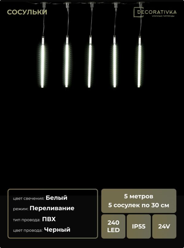 Гирлянда Тающие Сосульки 5шт по 30см, 24В, 240 Белых Светодиодов, Провод Черный ПВХ, IP55