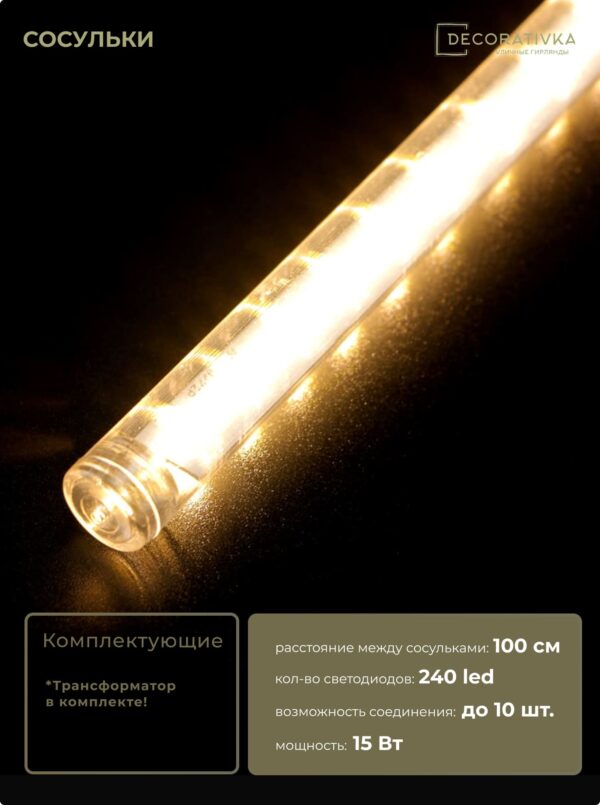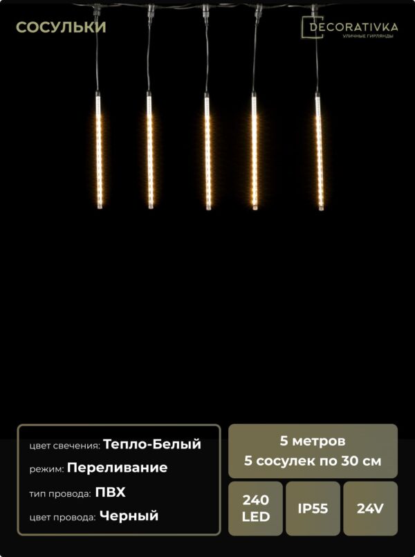 Гирлянда Тающие Сосульки 5шт по 30см, 24В, 240 Тепло-Белых Светодиодов, Провод Черный ПВХ, IP55