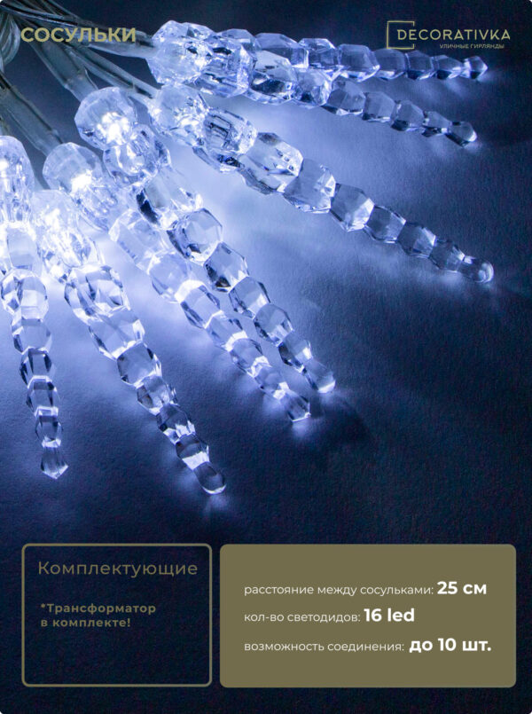 Гирлянда Сосульки 4м Белые 9см 24В, 16LED, Провод Прозрачный ПВХ, IP54