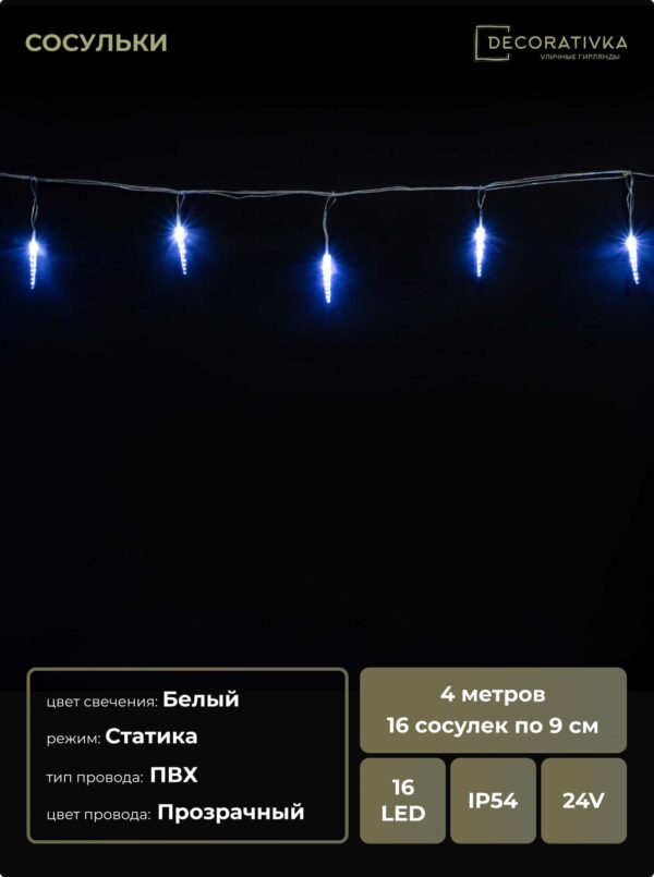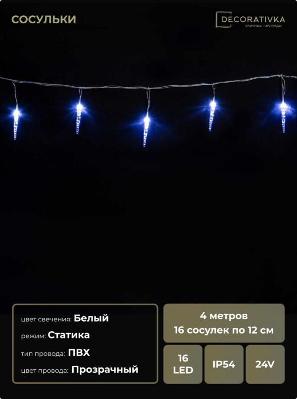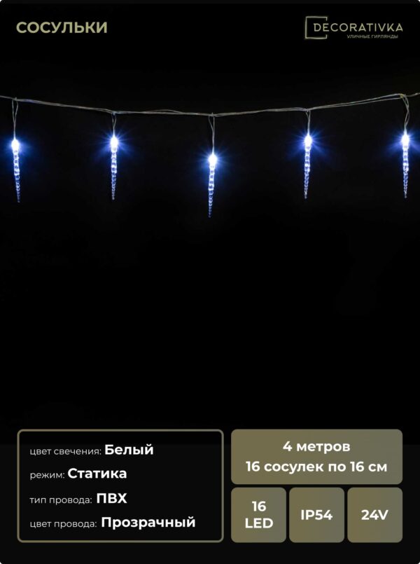 Гирлянда Сосульки 4м Белые 16см 24В, 16LED, Провод Прозрачный ПВХ, IP54