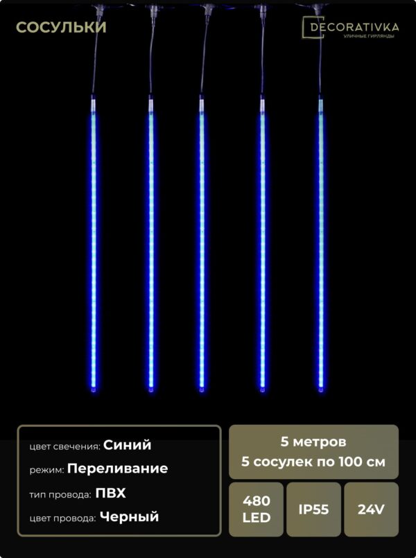 Гирлянда Тающие Сосульки 5шт по 100см, 24В, 480 Синих Светодиодов, Провод Черный ПВХ, IP55
