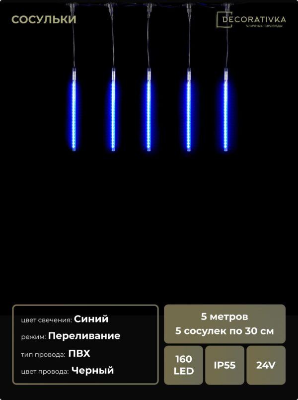 Гирлянда Тающие Сосульки 5шт по 30см, 24В, 160 Синих Светодиодов, Провод Черный ПВХ, IP55