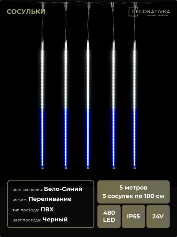 Гирлянда Тающие Сосульки 5шт по 100см, 24В, 480 Бело-Синих Светодиодов, Провод Черный ПВХ, IP55