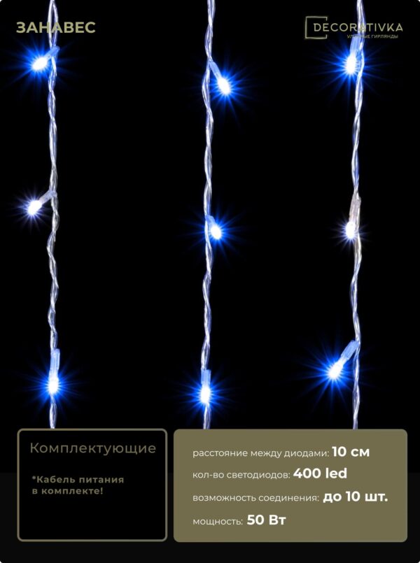 Гирлянда Занавес 2 x 2 м Синий с Мерцанием Белого Диода 220В, 400 LED, Провод Прозрачный ПВХ, IP54