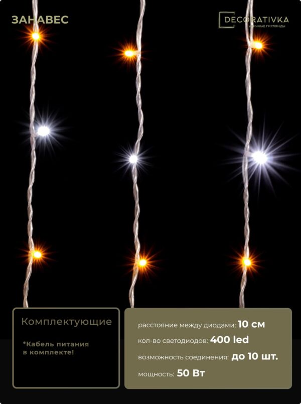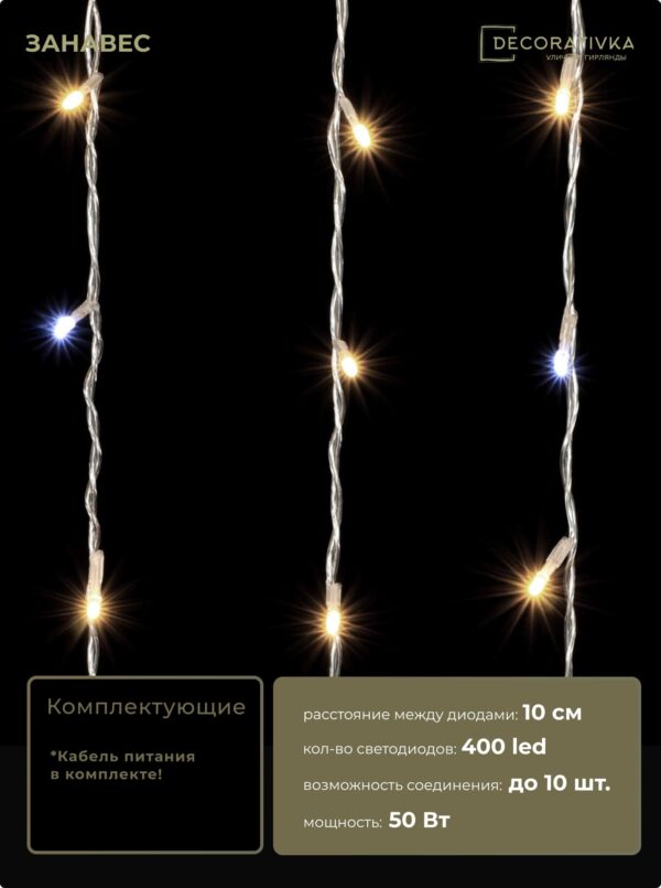 Гирлянда Занавес Облегченный 2 x 2 м Экстра Тепло-Белый с Мерцанием Белого Диода 220В, 400 LED, Провод Прозрачный ПВХ, IP54