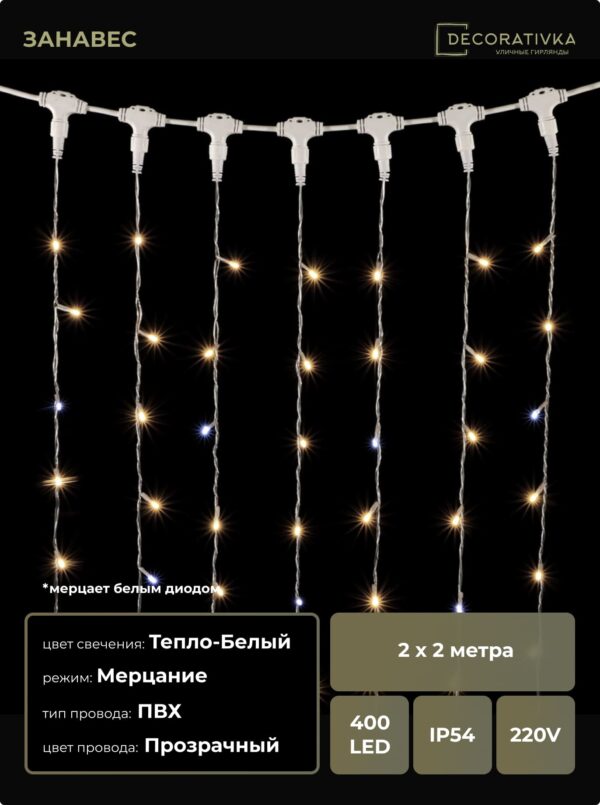 Гирлянда Занавес 2 x 2 м Тепло-Белый с Мерцанием Белого Диода 220В, 400 LED, Провод Прозрачный ПВХ, IP54