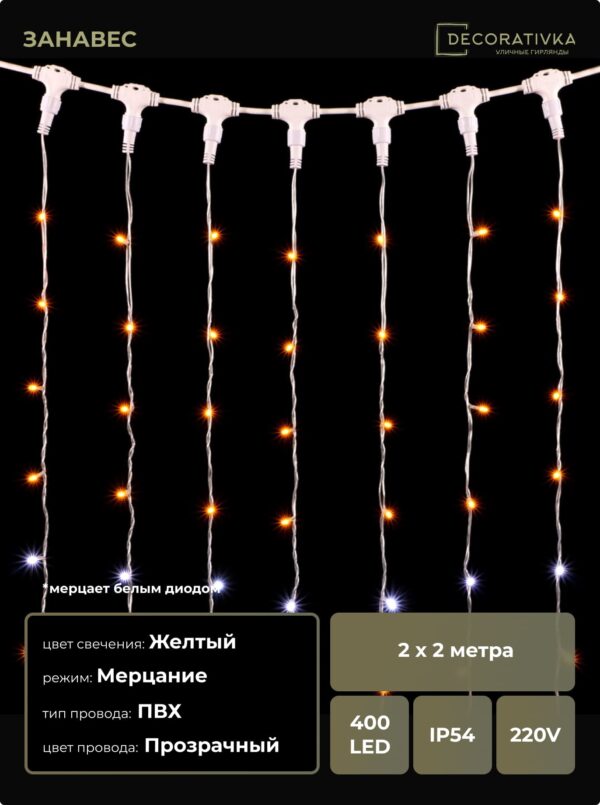 Гирлянда Занавес 2 x 2 м Желтый с Мерцанием Белого Диода 220В, 400 LED, Провод Прозрачный ПВХ, IP54