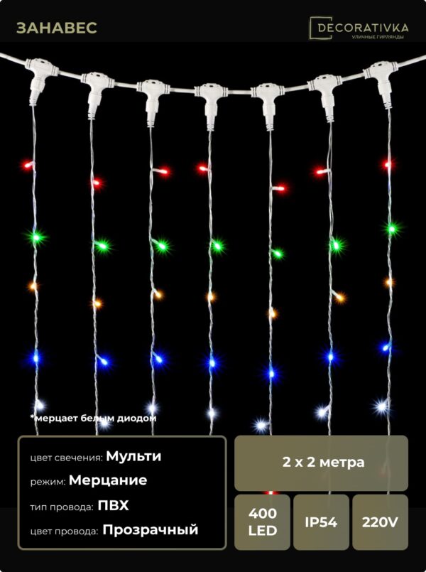 Гирлянда Занавес 2 x 2 м Разноцветный с Мерцанием Белого Диода 220В, 400 LED, Провод Прозрачный ПВХ, IP54