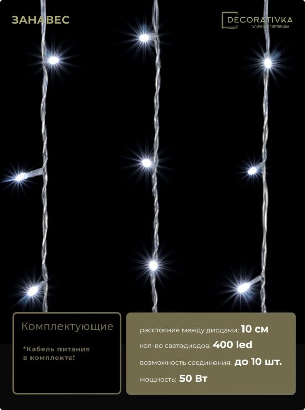 Гирлянда Занавес 2 x 2 м Белый с Мерцанием Белого Диода 220В, 400 LED, Провод Прозрачный ПВХ, IP54