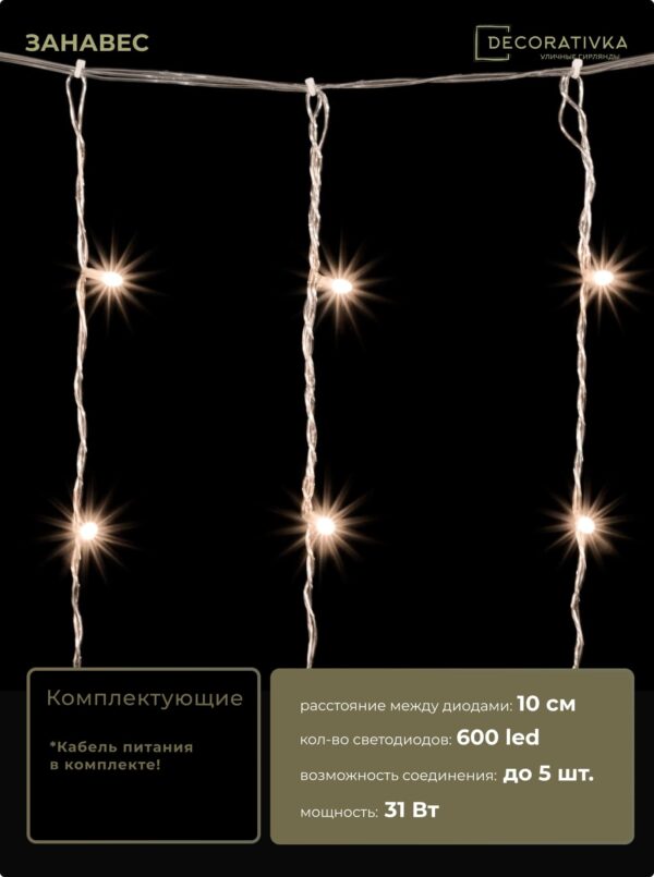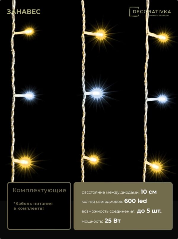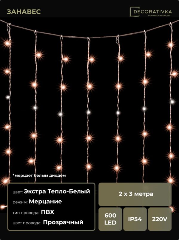 Гирлянда Занавес Облегченный 2 x 3 м Экстра Тепло-Белый с Мерцанием Белого Диода 220В, 600 LED, Провод Прозрачны ПВХ, IP54