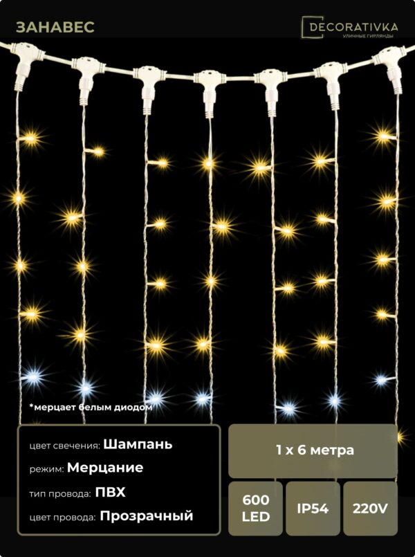 Гирлянда Занавес 1 x 6 м Шампань с Мерцанием Белого Диода, 600 LED, Провод Прозрачный ПВХ, IP54