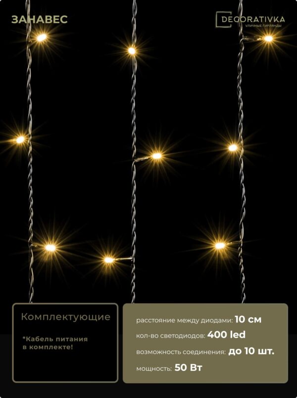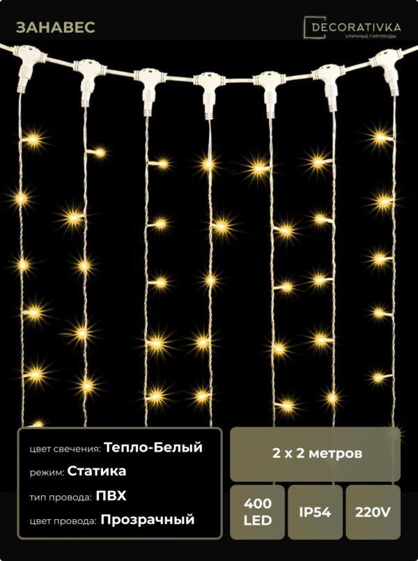 Гирлянда Занавес 2 x 2 м Тепло-Белый 220В, 400 LED, Провод Черный ПВХ, IP54