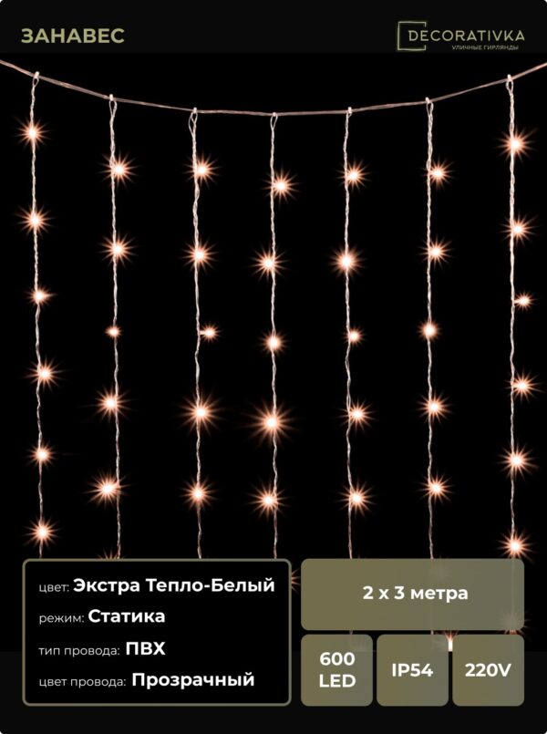 Гирлянда Занавес Облегченный 2 x 3 м Экстра Тепло-Белый 220В, 600 LED, Провод Прозрачный ПВХ, IP54