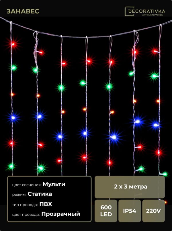 Гирлянда Занавес Облегченный 2 x 3 м Разноцветный 220В, 600 LED, Провод Прозрачный ПВХ, IP54