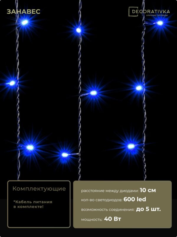 Гирлянда Занавес 2 x 3 м Синий 220В, 600 LED, Провод Черный ПВХ, IP54