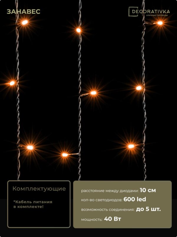 Гирлянда Занавес 2 x 3 м Желтый 220В, 600 LED, Провод Черный ПВХ, IP54