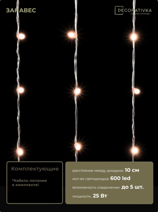 Гирлянда Занавес 2 x 3 м Тепло-Белый 220В, 600 LED, Провод Черный ПВХ, IP54