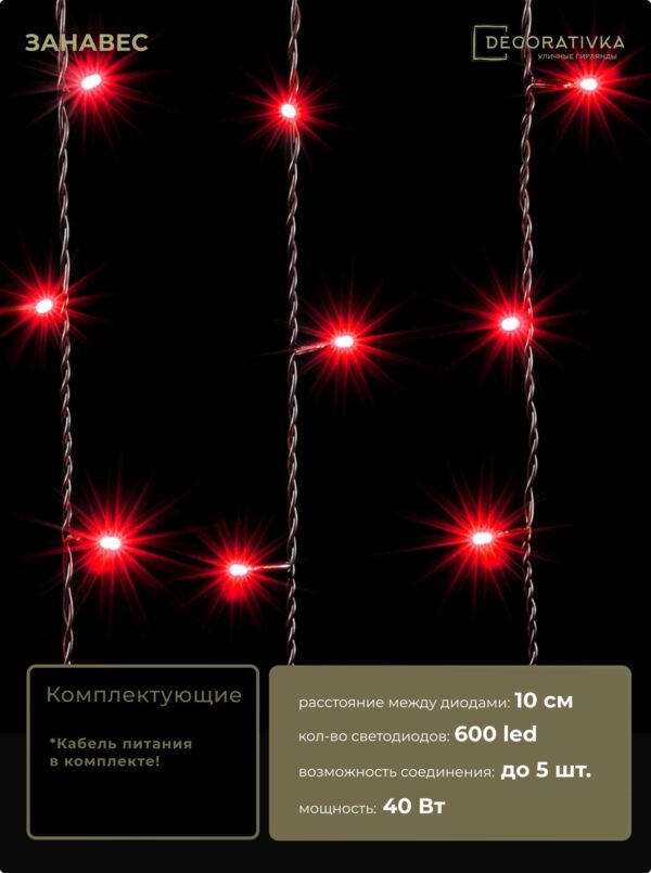 Гирлянда Занавес 2 x 3 м Красный 220В, 600 LED, Провод Черный ПВХ, IP54