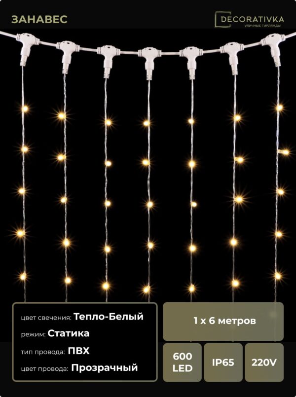 Гирлянда Занавес с Колпачком 1 x 6 м Тепло-Белый 220В, 600 LED, Провод Прозрачный ПВХ, IP65