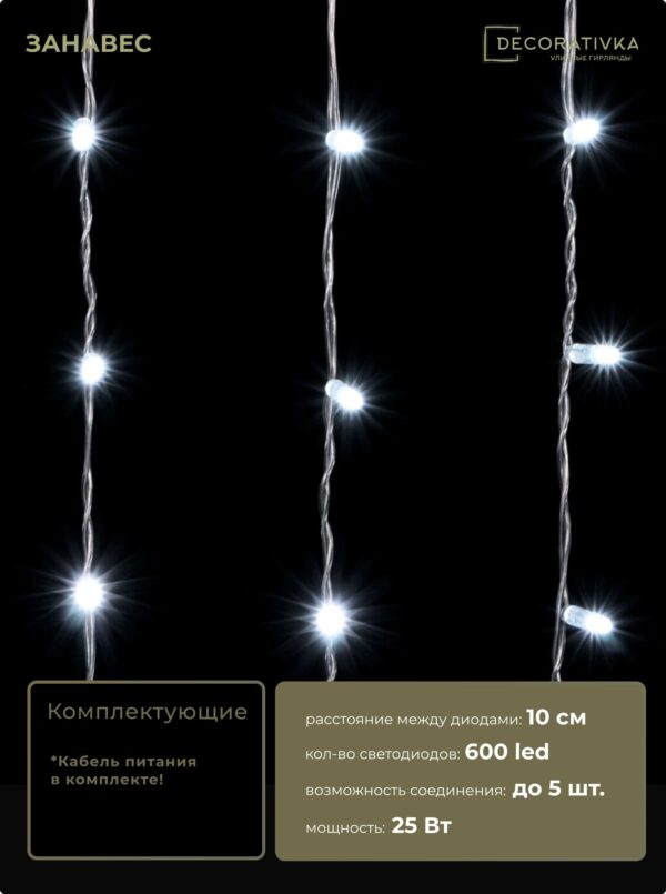 Гирлянда Занавес 2 x 3 м Белый 220В, 600 LED, Провод Черный ПВХ, IP54