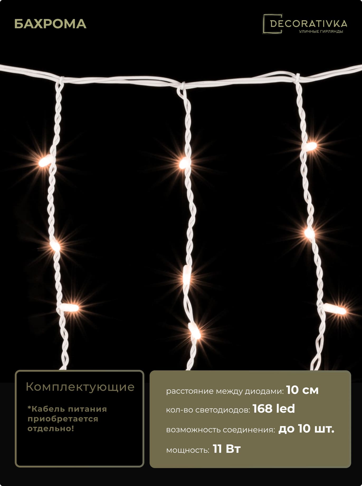 Гирлянда Бахрома 3,2 x 0,9 м Экстра Тепло-Белая с Мерцанием Белого Диода 220В, 168 LED, Провод Белый Каучук, IP65