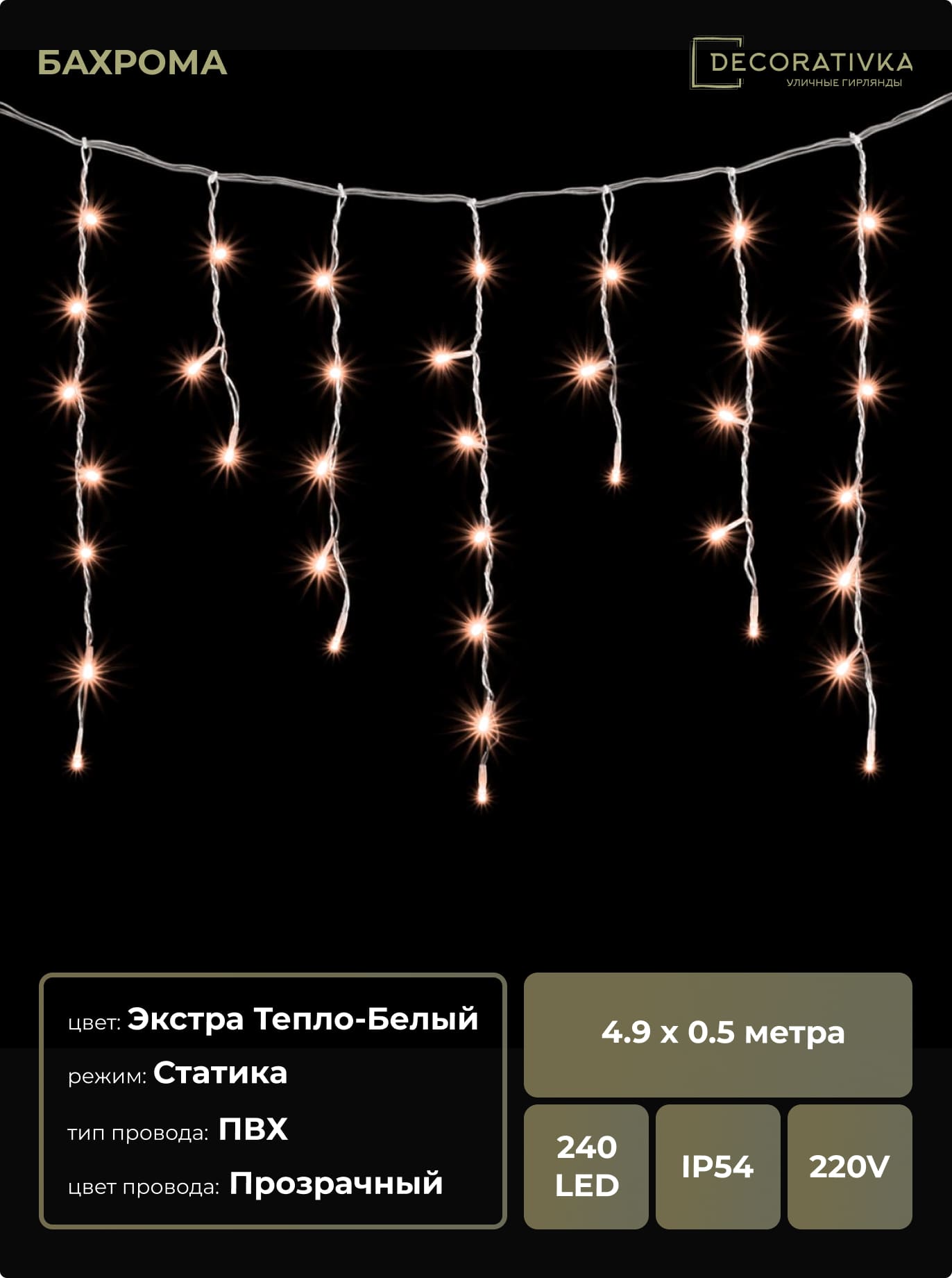 Гирлянда Бахрома 4,9 x 0,5 м Экстра Тепло-Белая 220В, 240 LED, Провод Прозрачный ПВХ, IP54