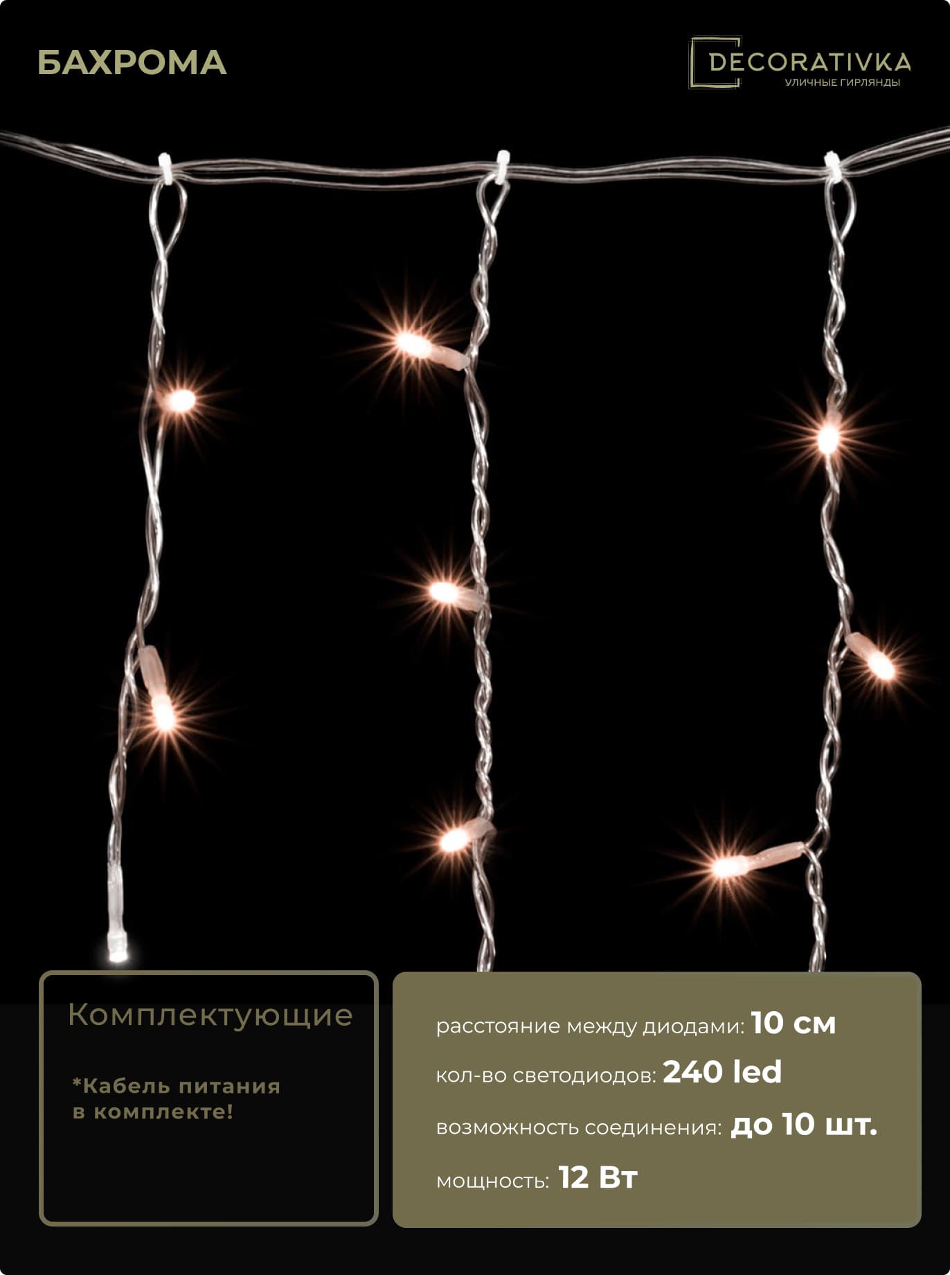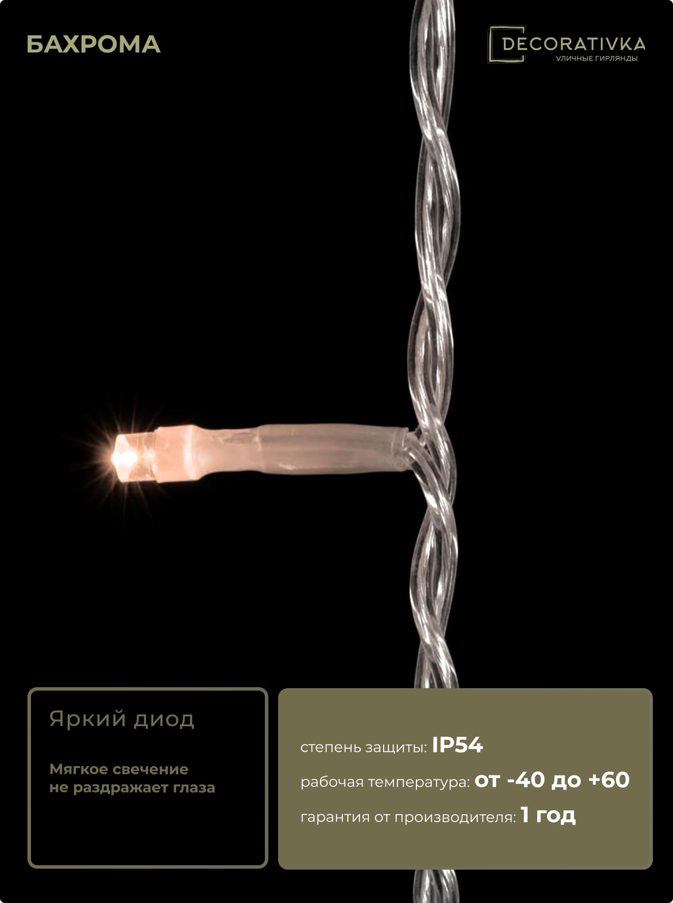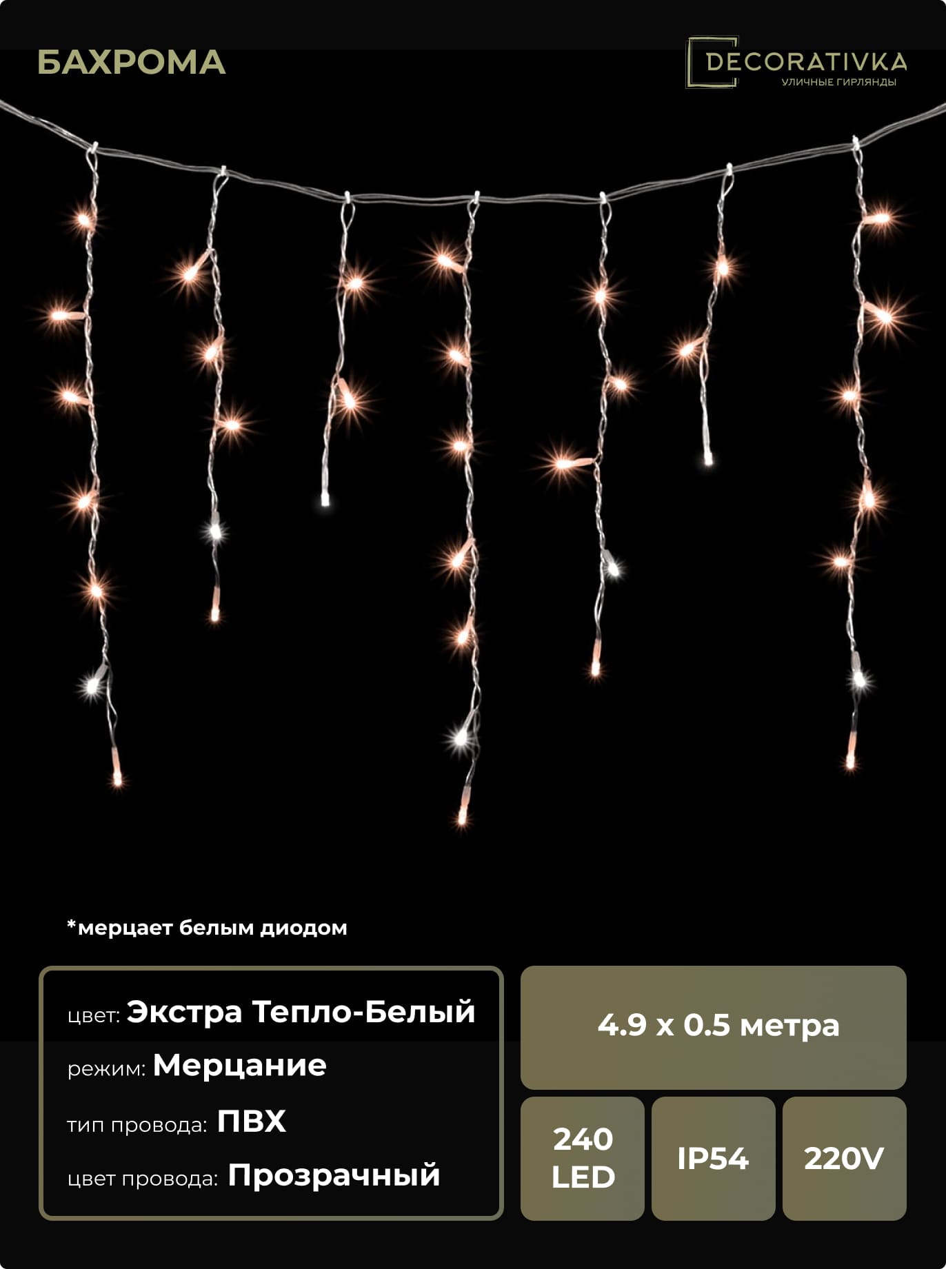 Гирлянда Бахрома 4,9 x 0,5 м Экстра Тепло-Белая с Мерцанием Белого Диода 220В, 240 LED, Провод Прозрачный ПВХ, IP54