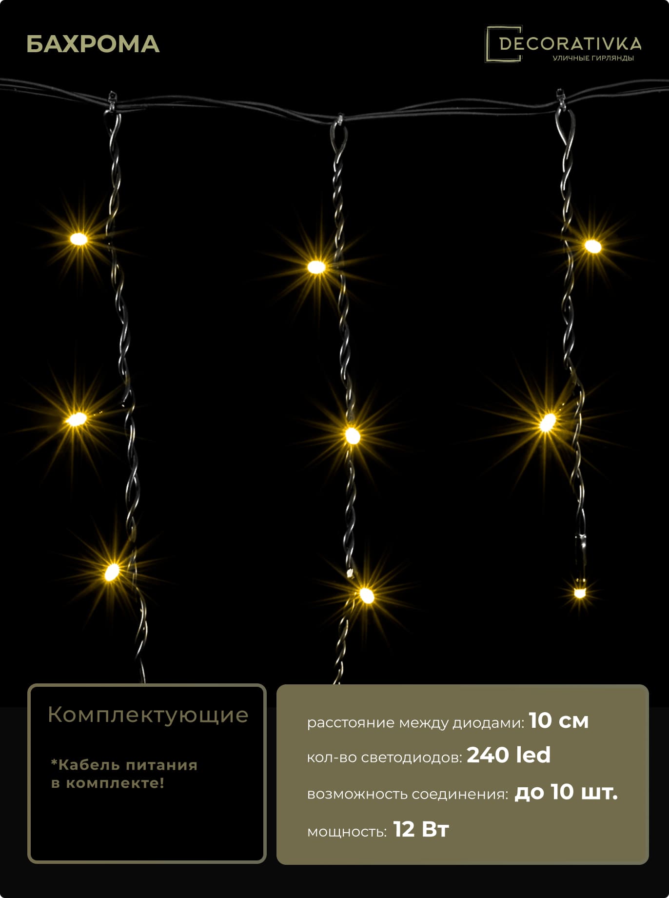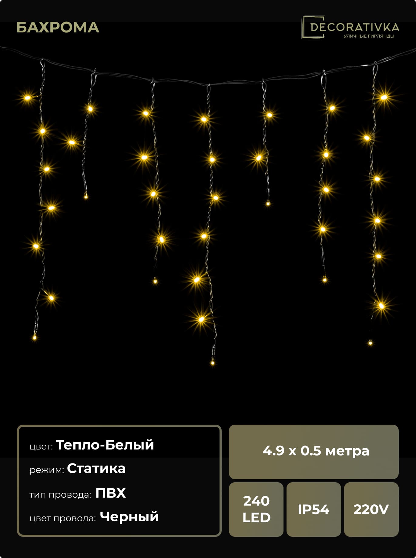 Гирлянда Бахрома 4,9 x 0,5 м Тепло-Белая 220В, 240 LED, Провод Черный ПВХ, IP54