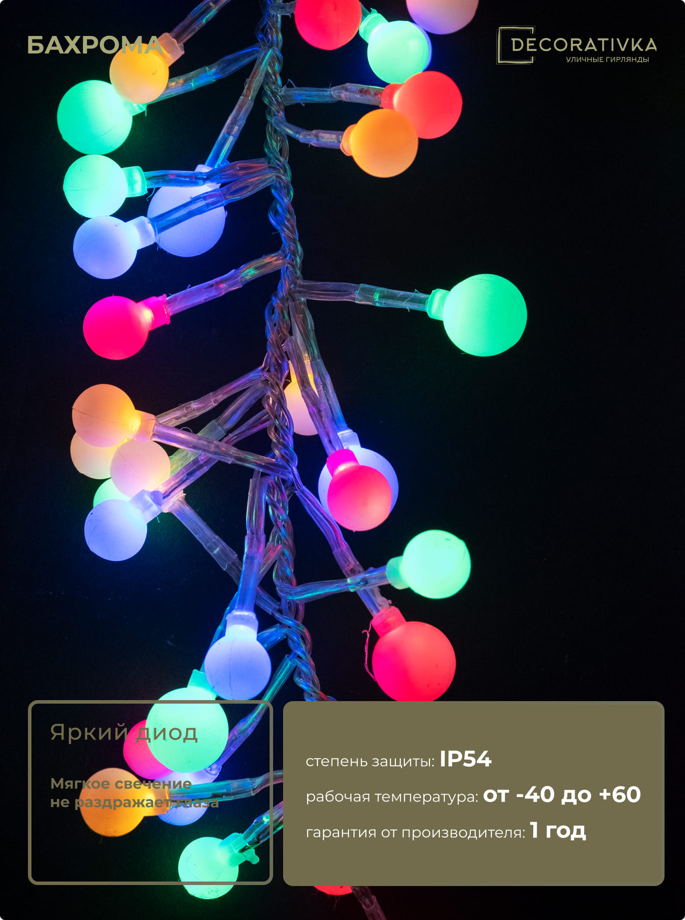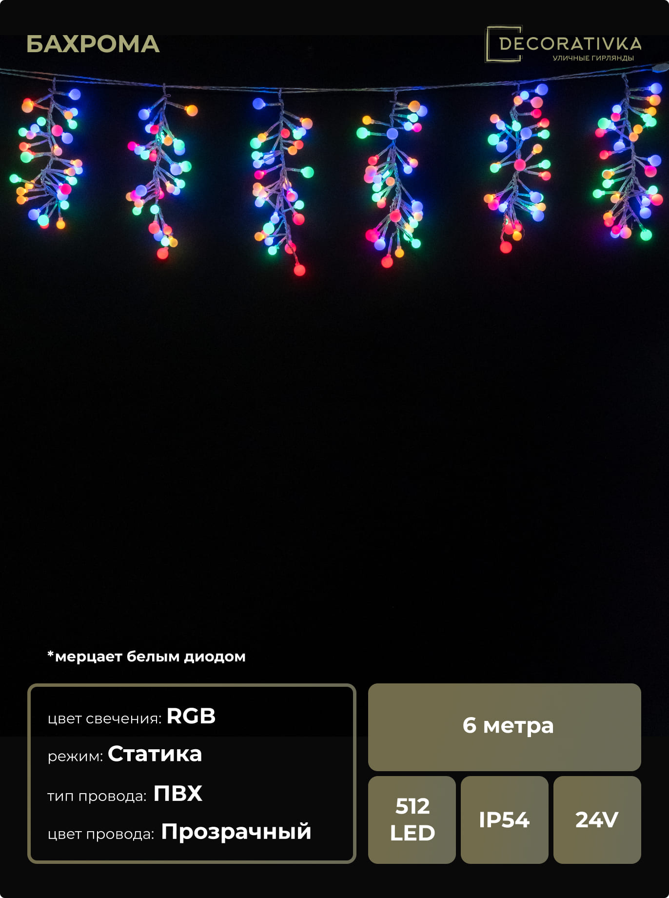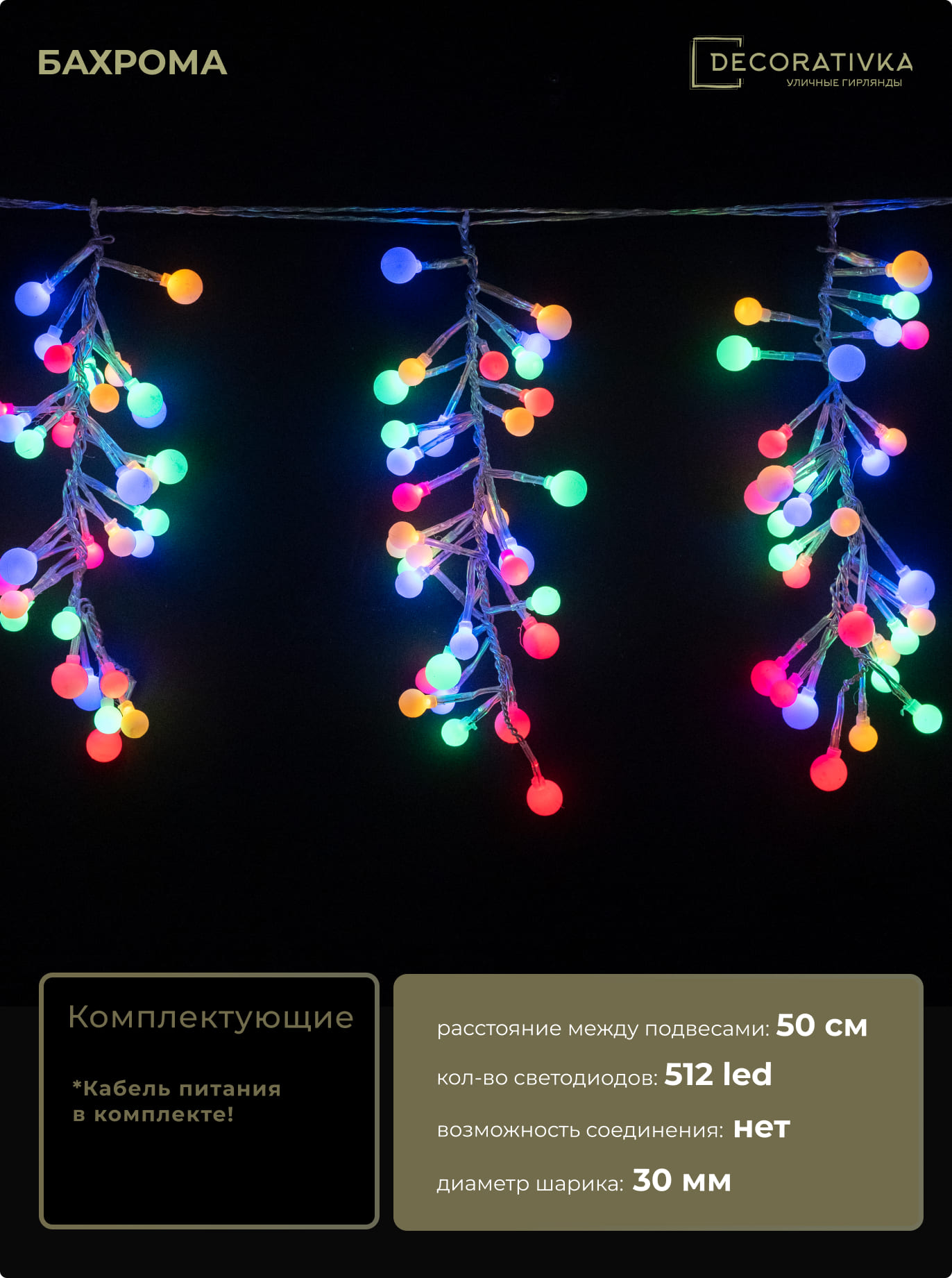 Гирлянда Бахрома Грозди Винограда 6м Разноцветная 24В, Диаметр Шарика 30мм, 512 LED, Провод Черный ПВХ, IP54