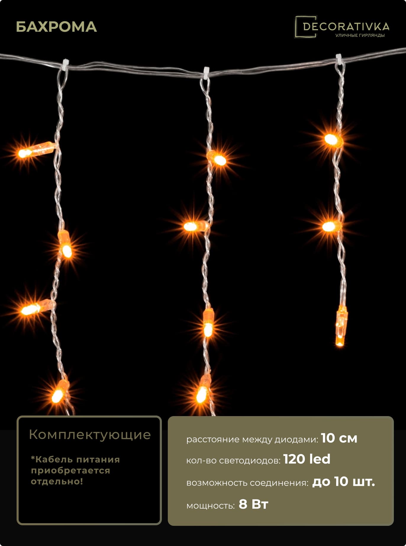 Гирлянда Бахрома с Колпачком 3,1 x 0,5 м Желтая 220В, 120 LED, Провод Прозрачный ПВХ, IP65