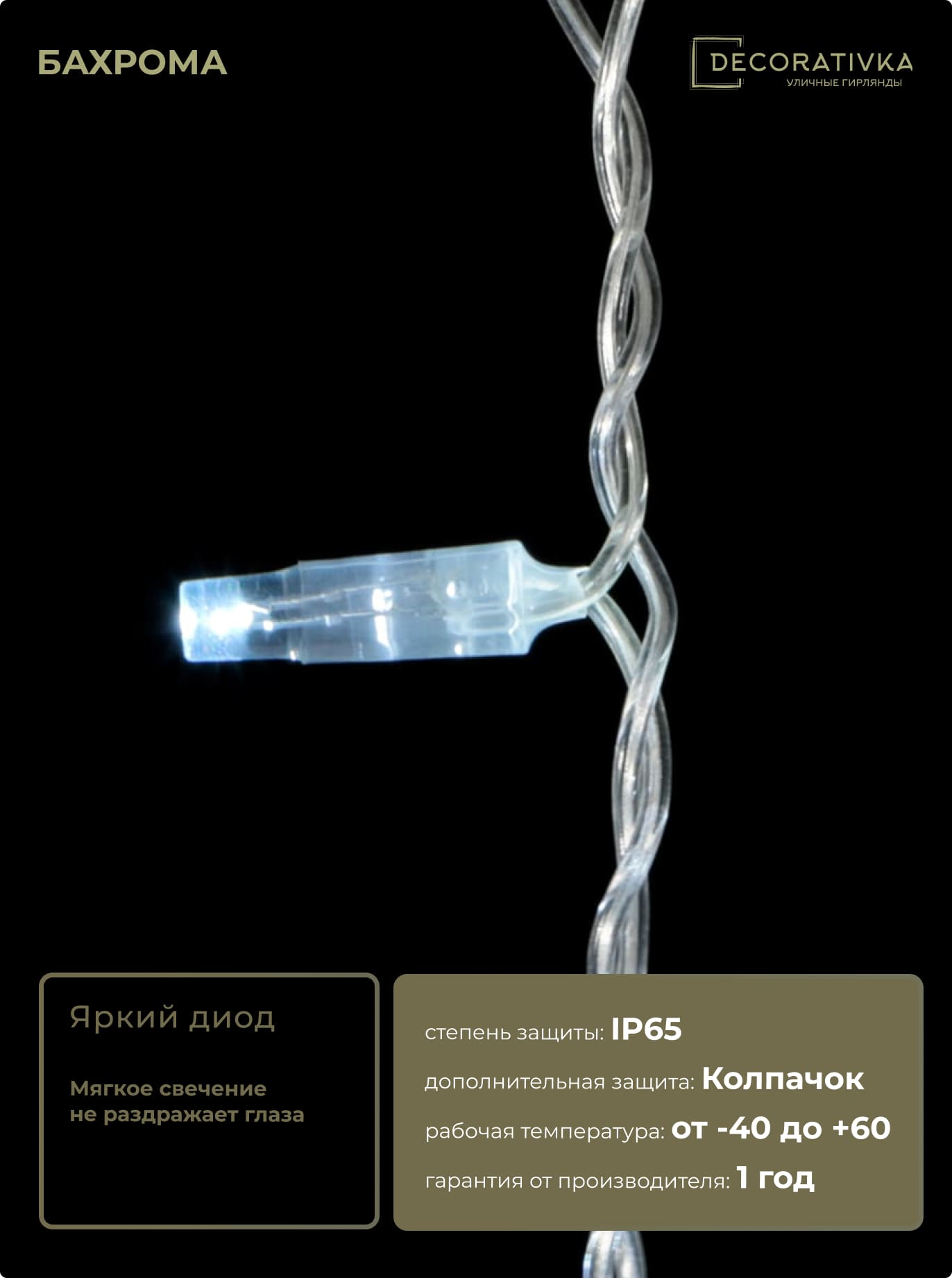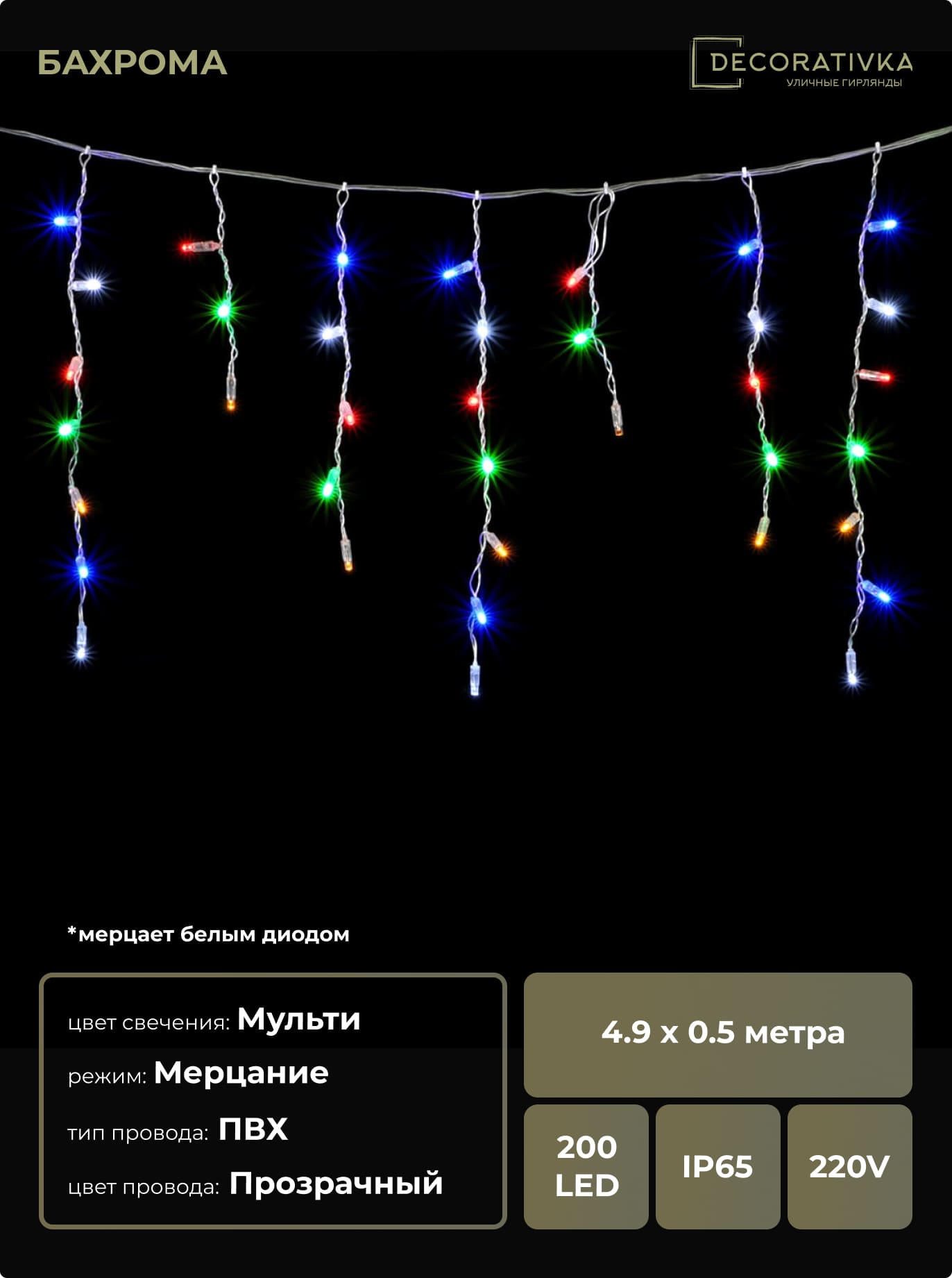 Гирлянда Бахрома с Колпачком 4,9 x 0,5 м Разноцветная с Мерцанием Белого Диода 220В, 200 LED, Провод Прозрачный ПВХ, IP65
