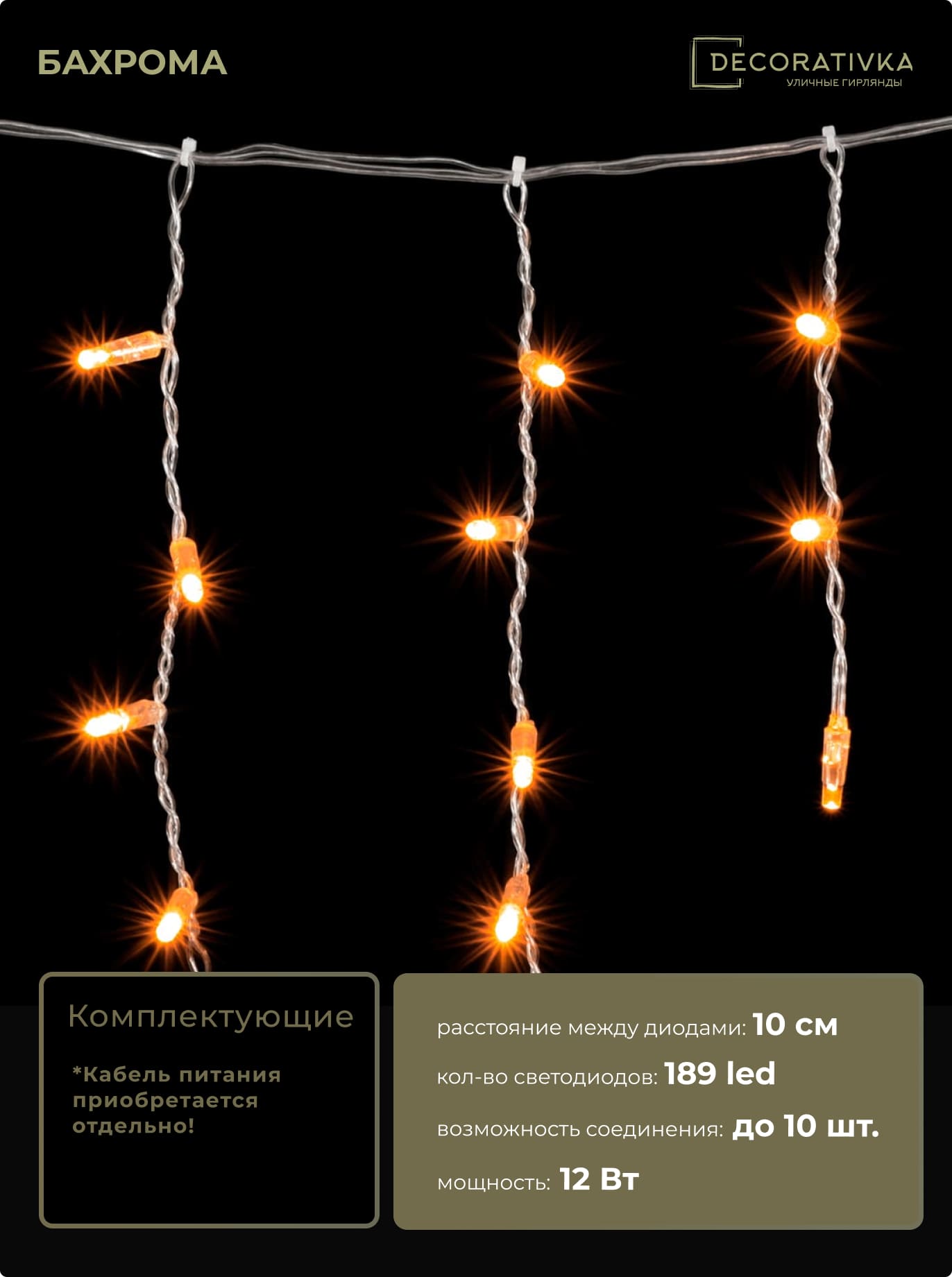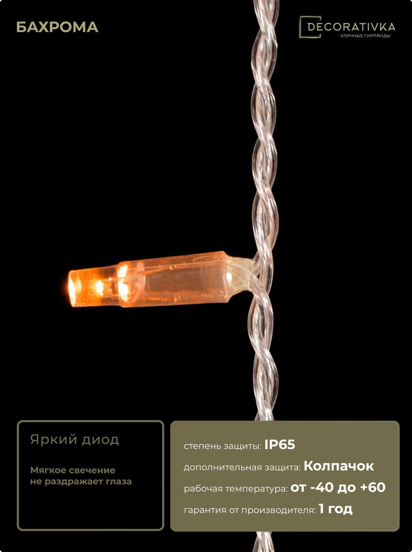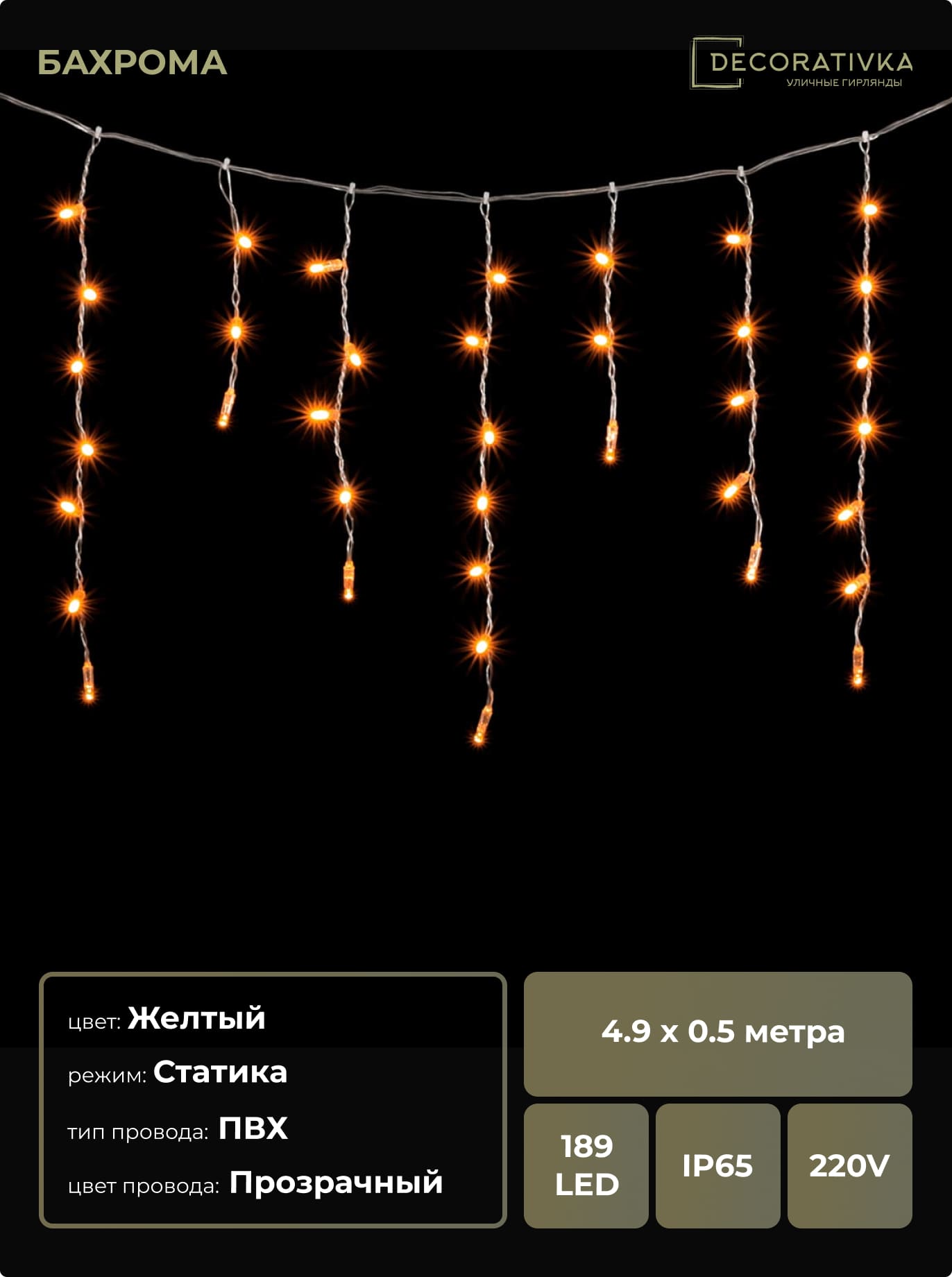 Гирлянда Бахрома с Колпачком 4,9 x 0,5 м Жёлтая 220В, 189 LED, Провод Прозрачный ПВХ, IP65