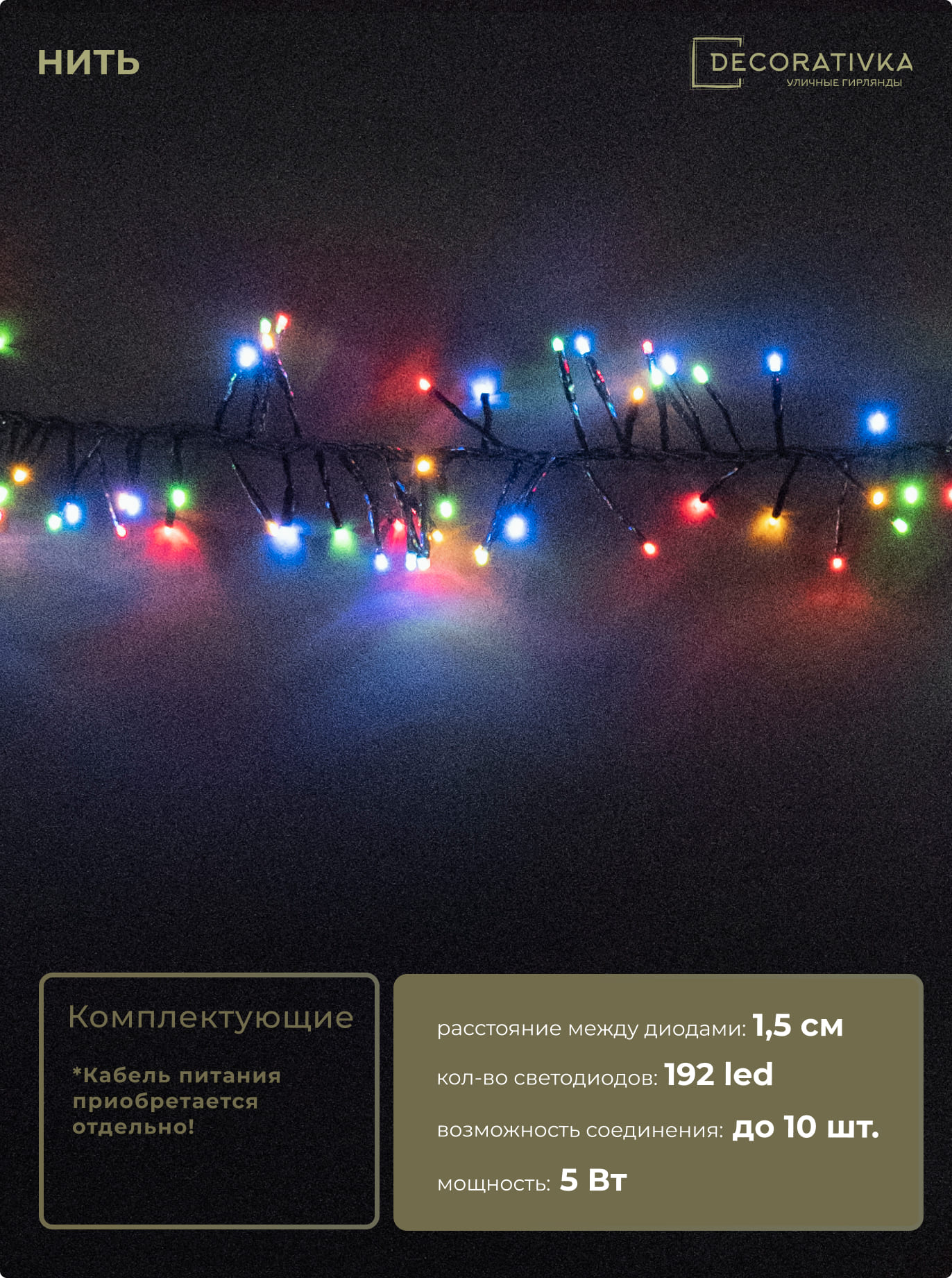Гирлянда Кластерная с Мини Диодами 2,4м Разноцветная 220В, 192 LED, Провод Черный ПВХ, IP54