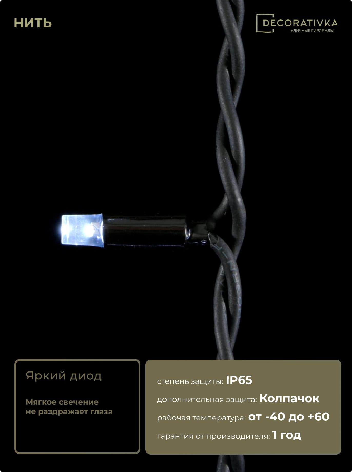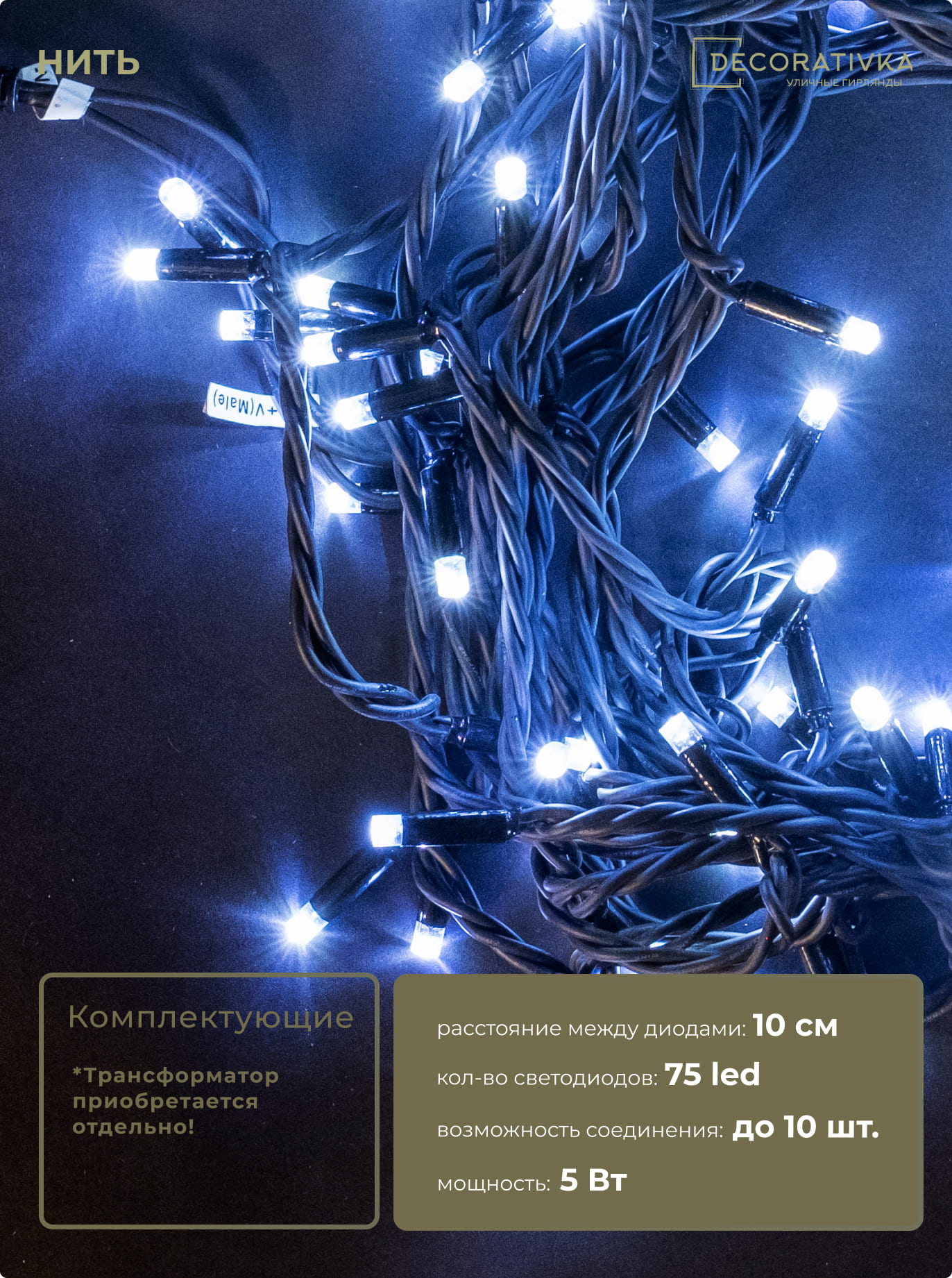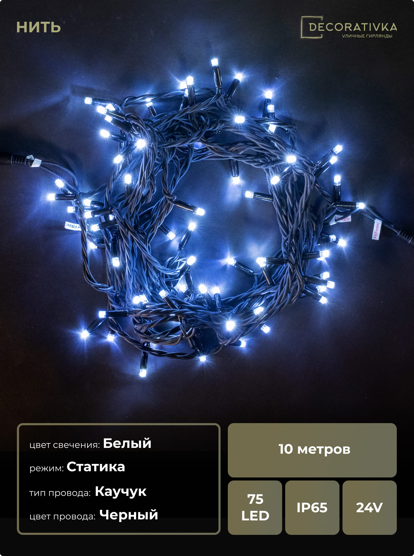 Гирлянда Нить 10м Белая 24В, 75 LED, Провод Черный Каучук, IP65