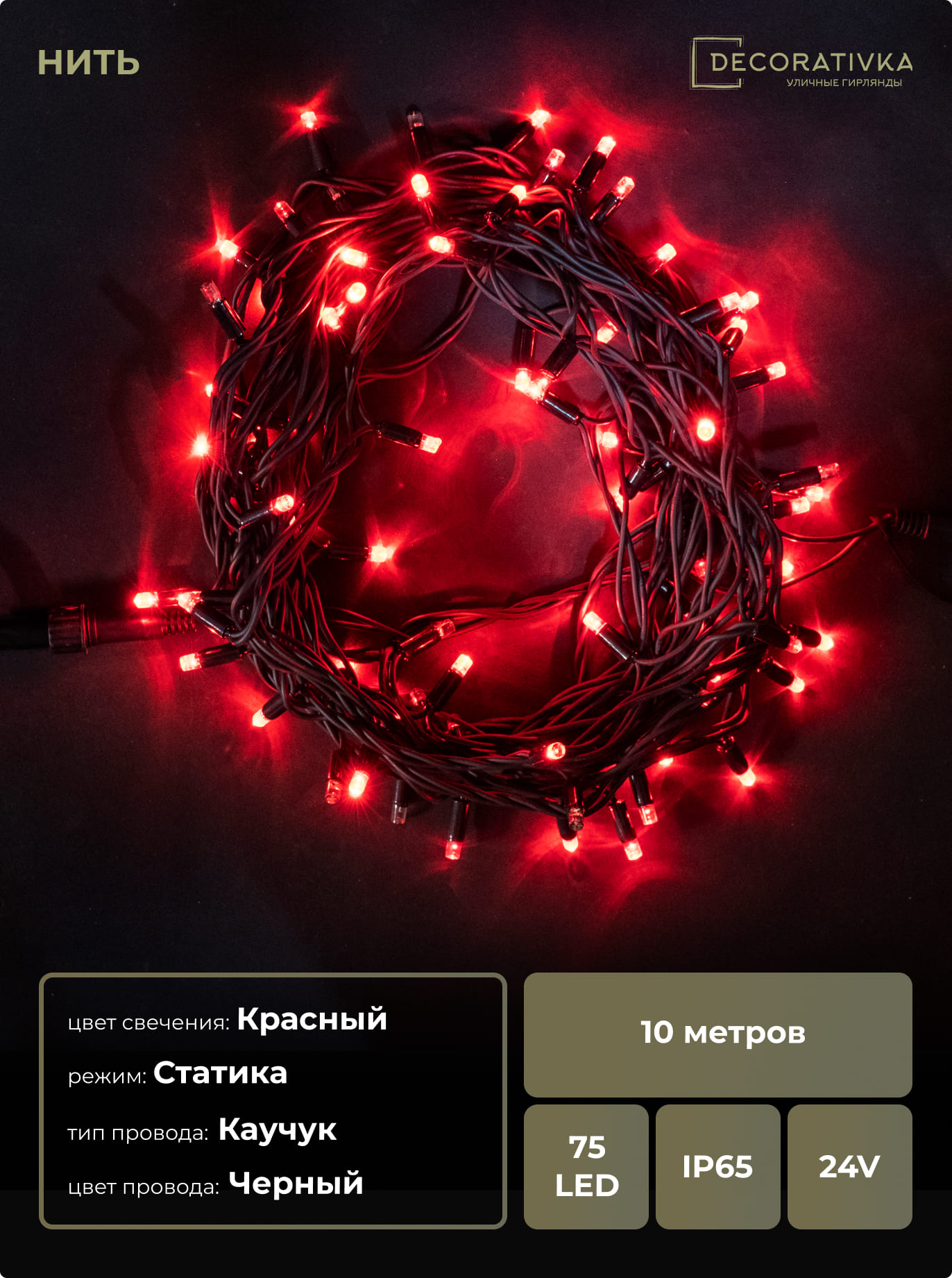 Гирлянда Нить 10м Красная 24В, 75 LED, Провод Черный Каучук, IP65
