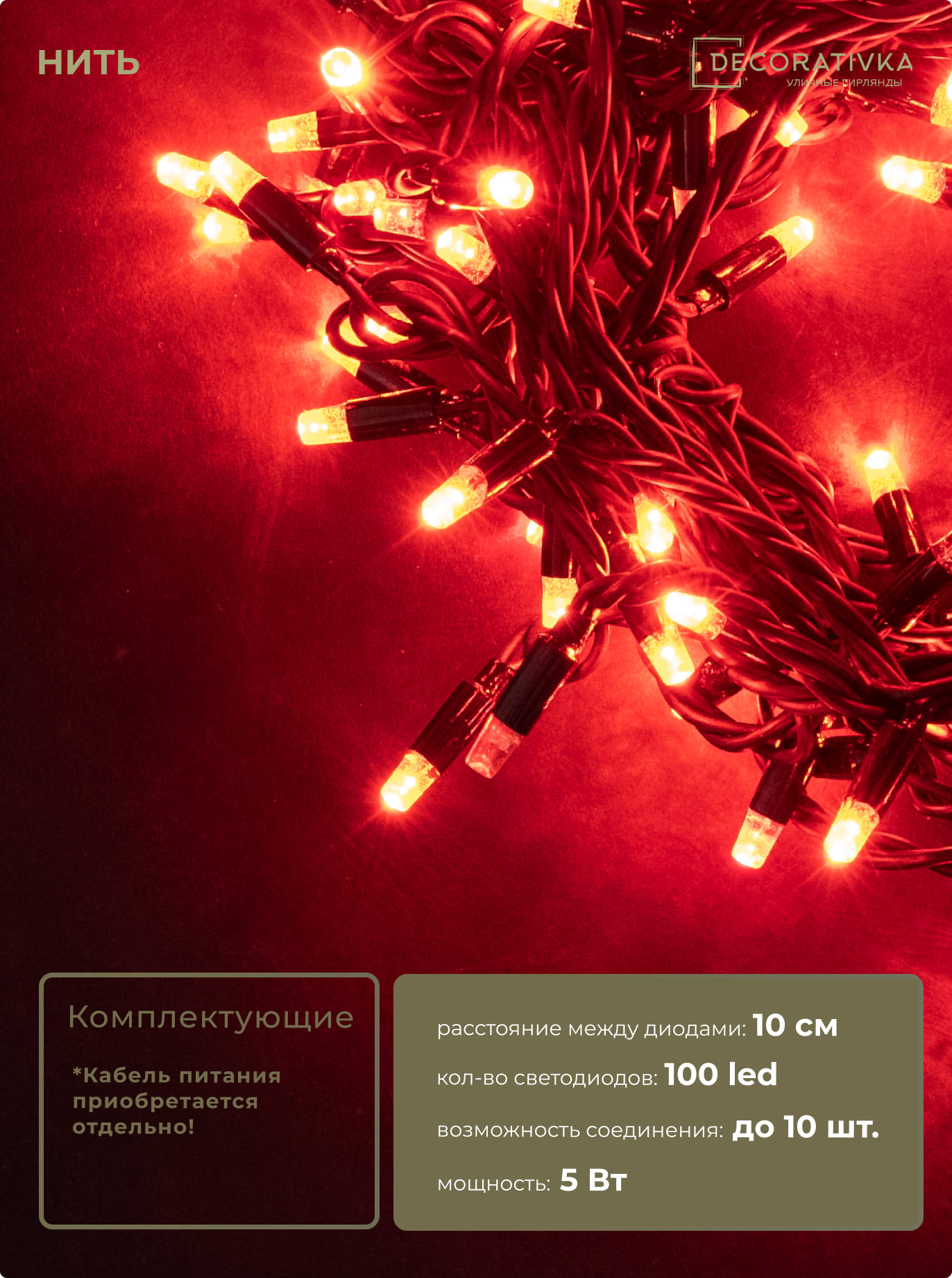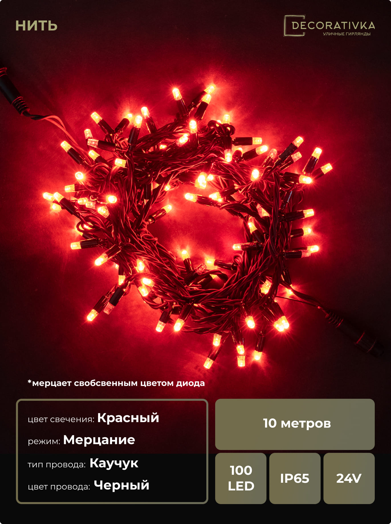 Гирлянда Нить 10м Красная с Мерцанием 24В, 100 LED, Провод Черный Каучук, IP65