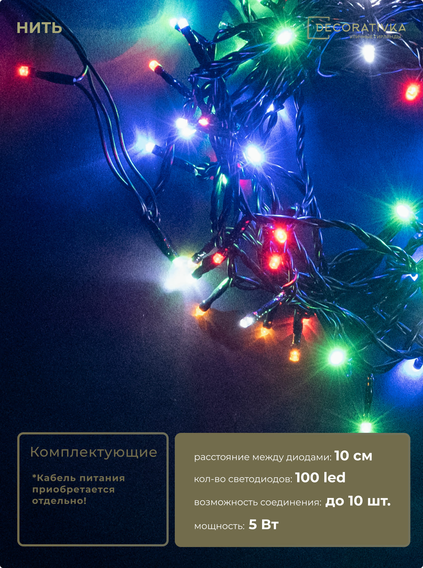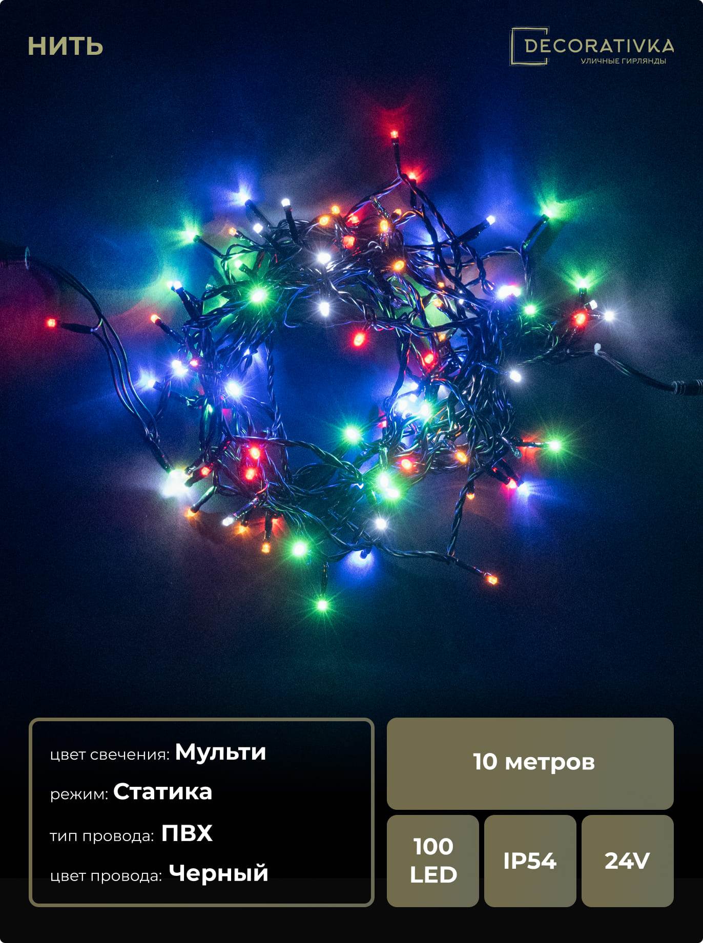 Гирлянда Нить 10м Разноцветная 24В, 100 LED, Провод Черный ПВХ, IP54