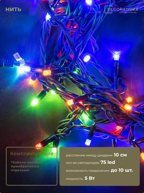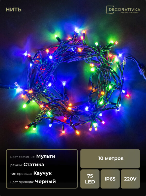 Гирлянда Нить 10м Разноцветная 24В, 75 LED, Провод Черный Каучук, IP65