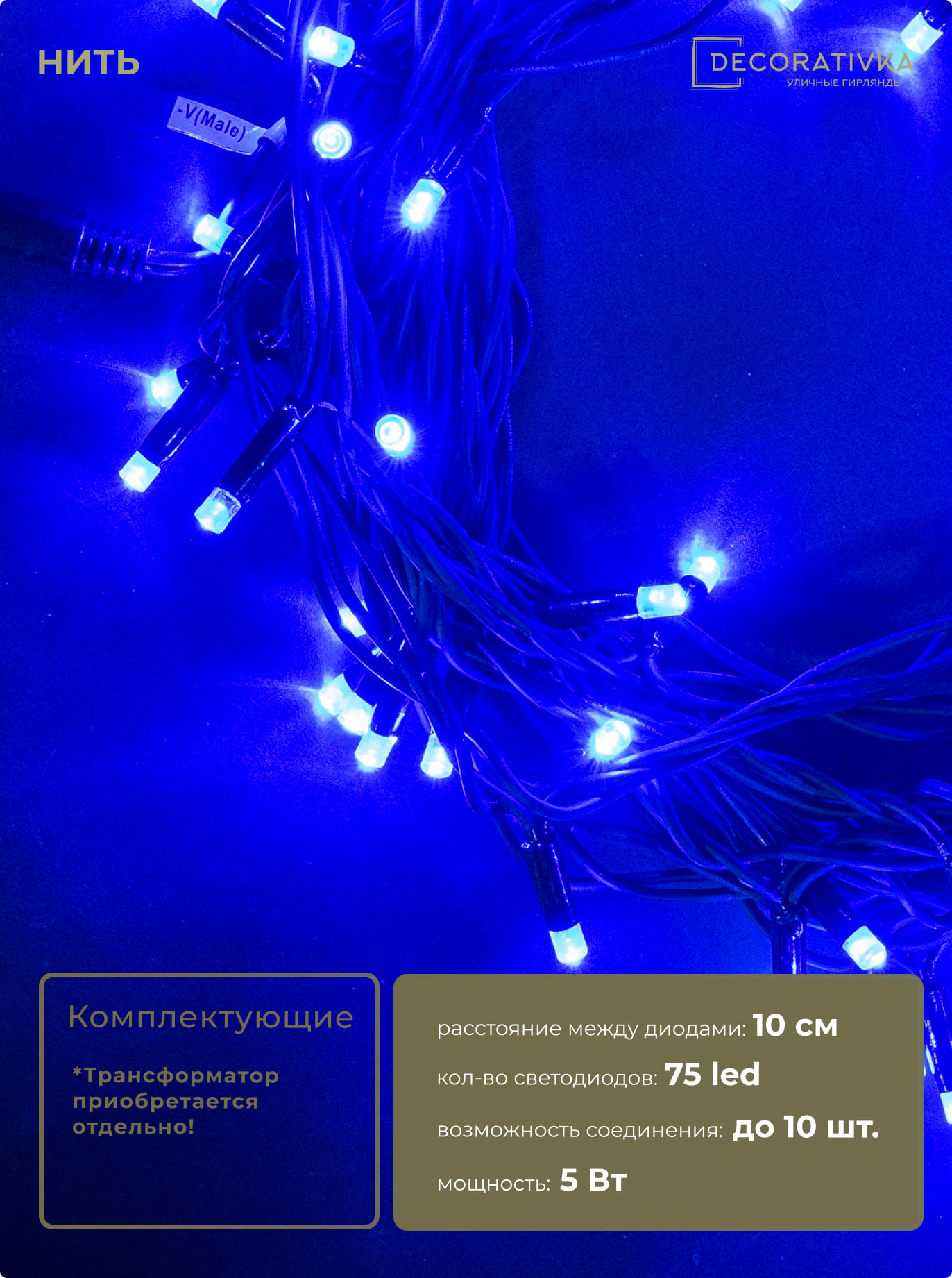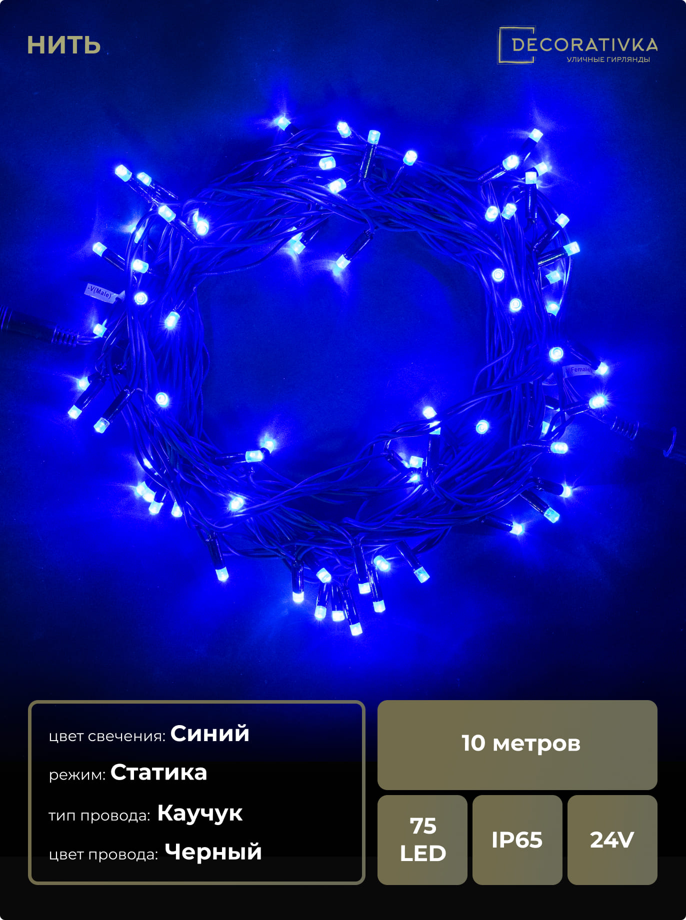 Гирлянда Нить 10м Синяя 24В, 75 LED, Провод Черный Каучук, IP65