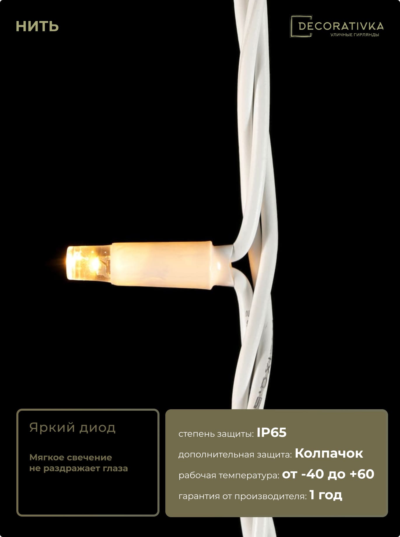 Гирлянда Нить 10м Тепло-Белая 24В, 100 LED, Провод Белый Каучук, IP65