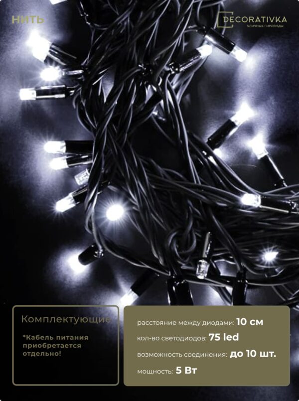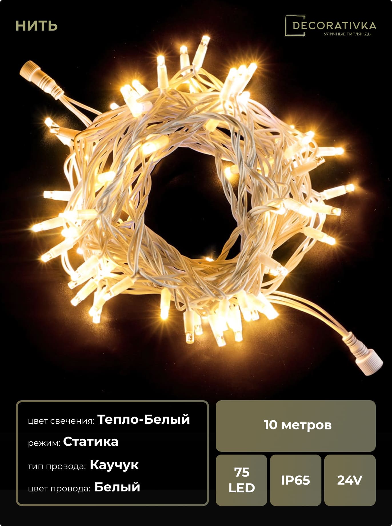 Гирлянда Нить 10м Тепло-Белая 24В, 75 LED, Провод Белый Каучук, IP65
