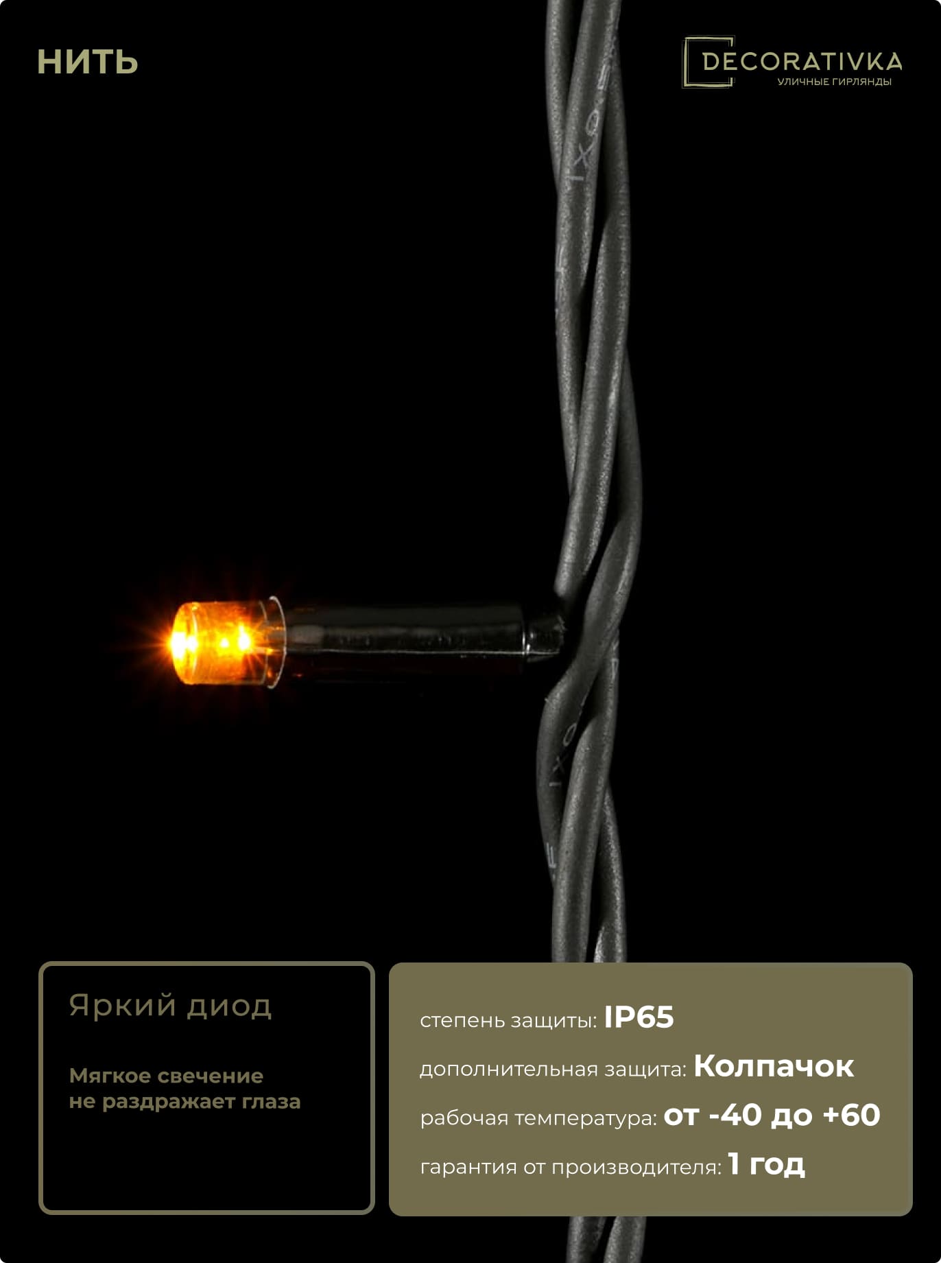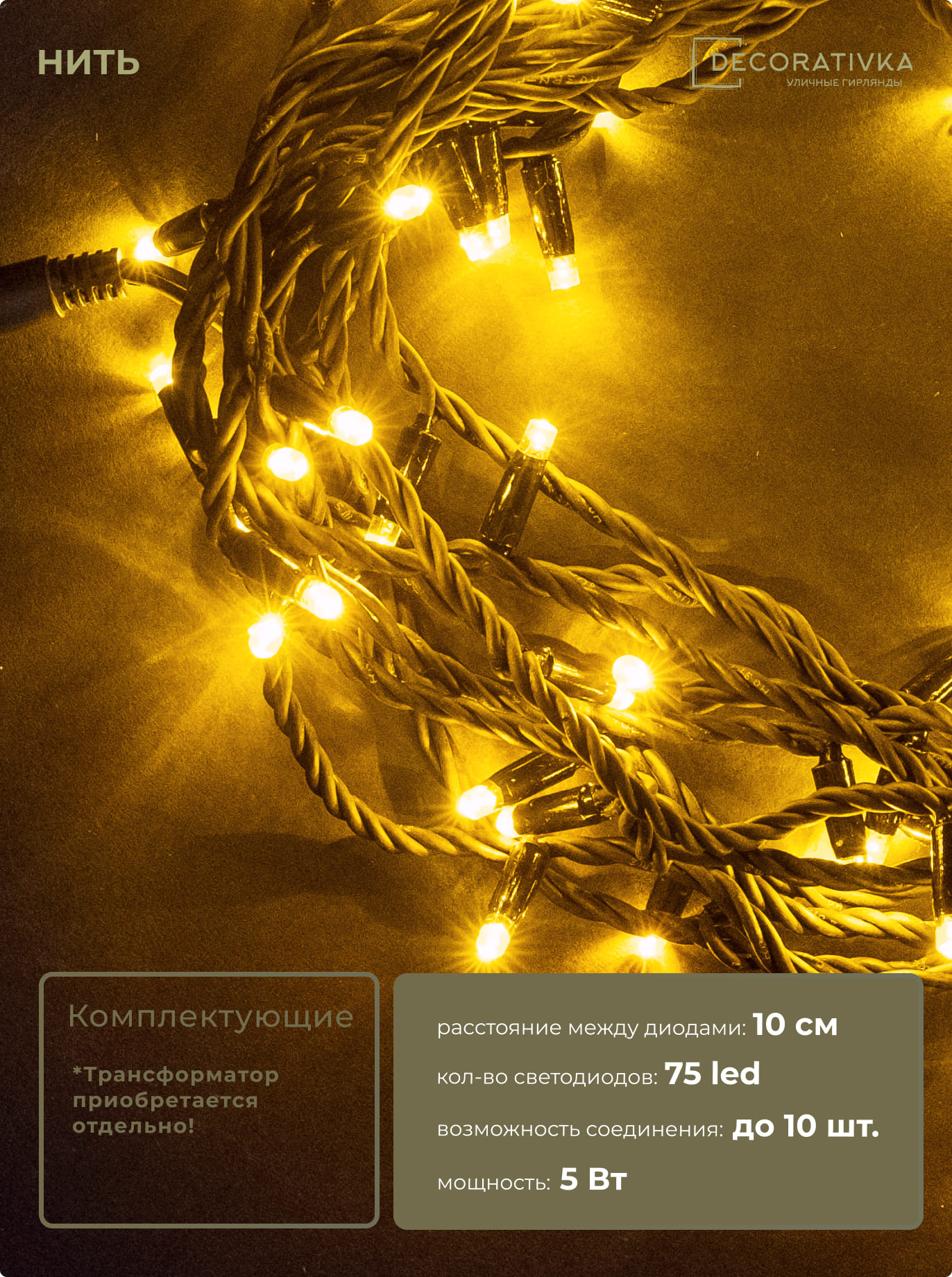 Гирлянда Нить 10м Желтая 24В, 75 LED, Провод Черный Каучук, IP65