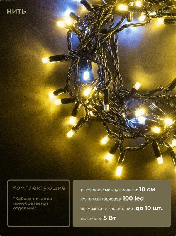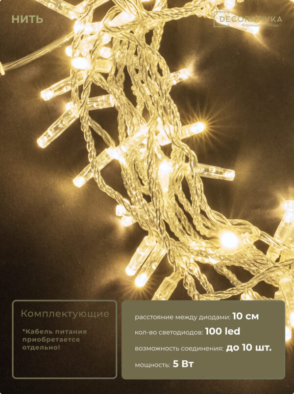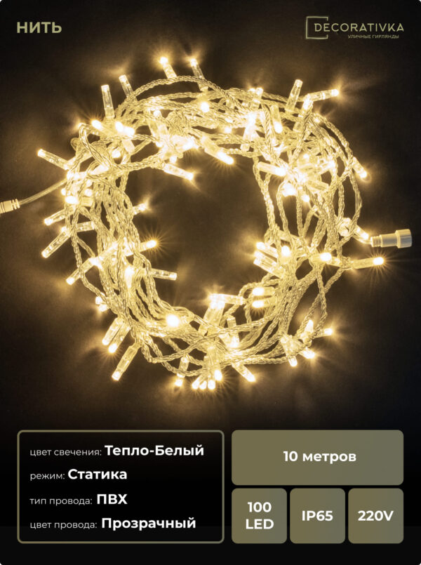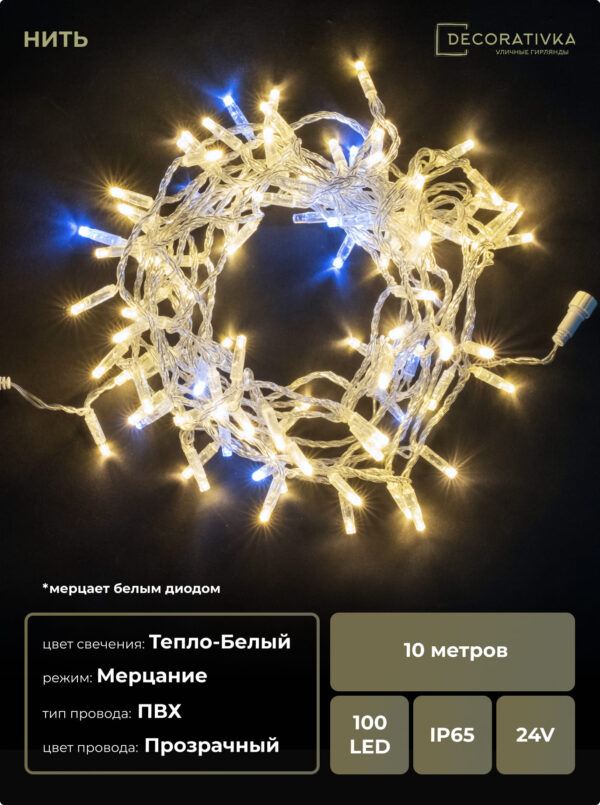 Гирлянда Нить с Колпачком 10м Белая 24В, 100 LED, Провод Прозрачный ПВХ, IP65