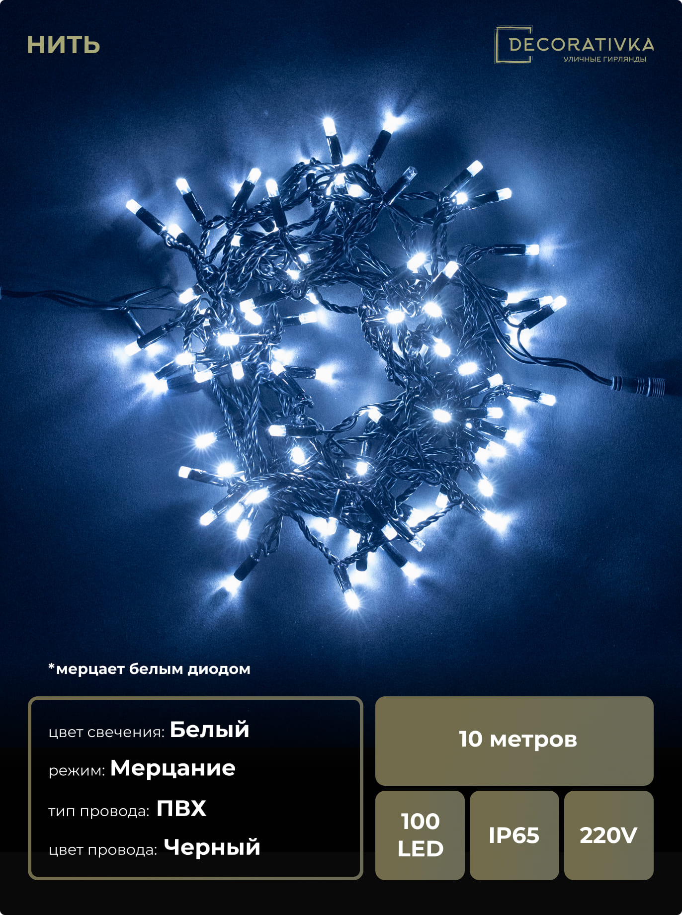 Гирлянда Нить с Колпачком 10м Белая с Мерцанием Белого Диода 220В, 100 LED, Провод Черный ПВХ, IP65