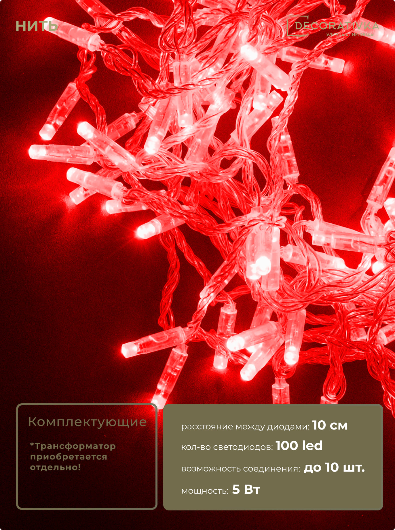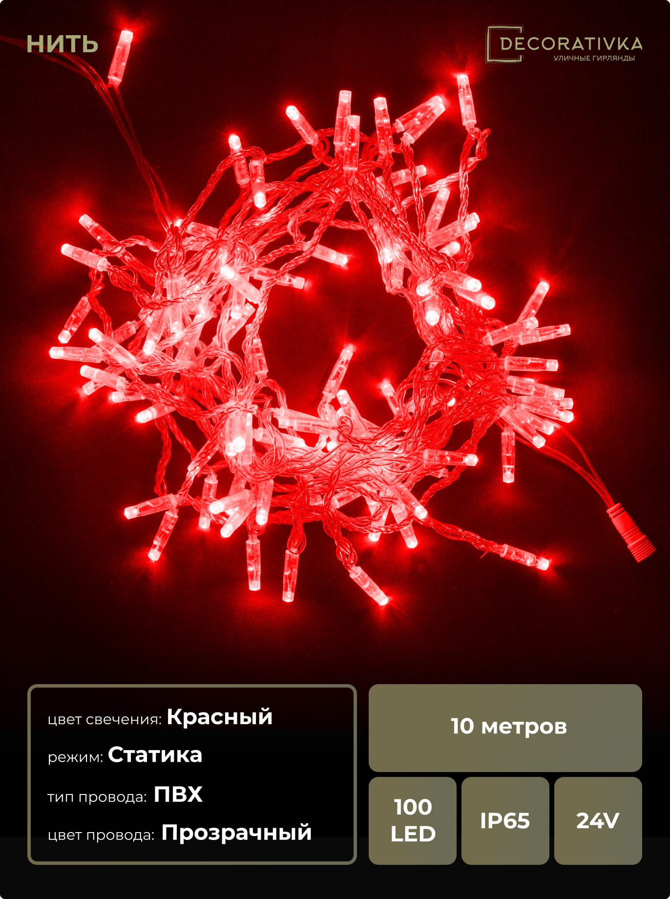 Гирлянда Нить с Колпачком 10м Красная 24В, 100 LED, Провод Прозрачный ПВХ, IP65