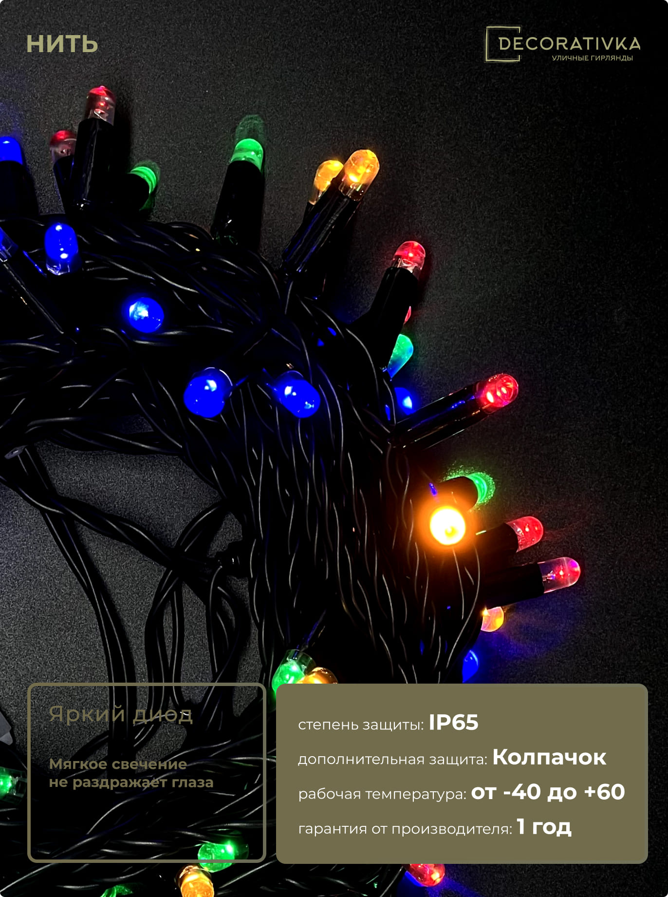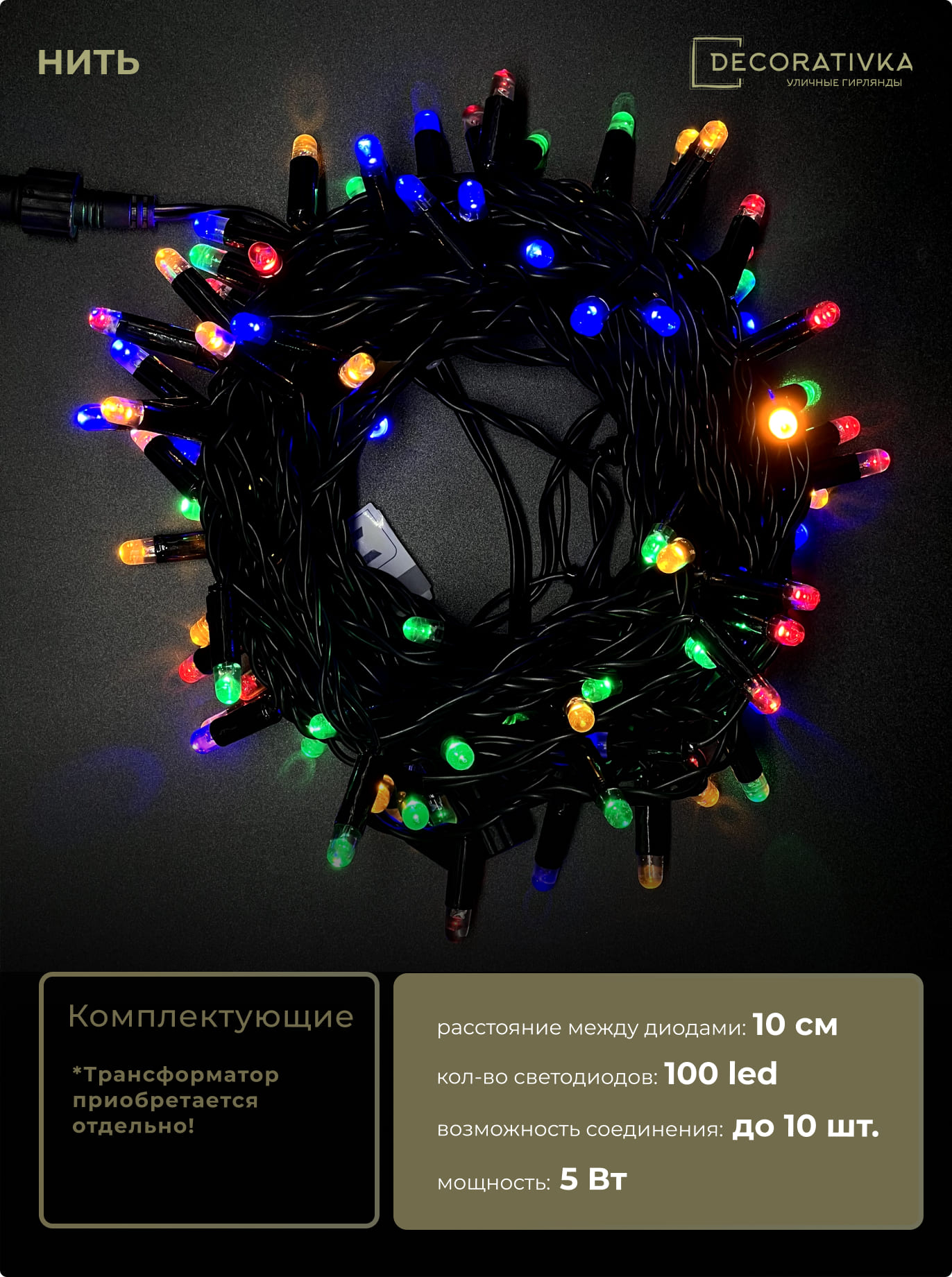 Гирлянда Нить с Колпачком 10м Разноцветная 24В, 100 LED, Провод Черный ПВХ, IP65