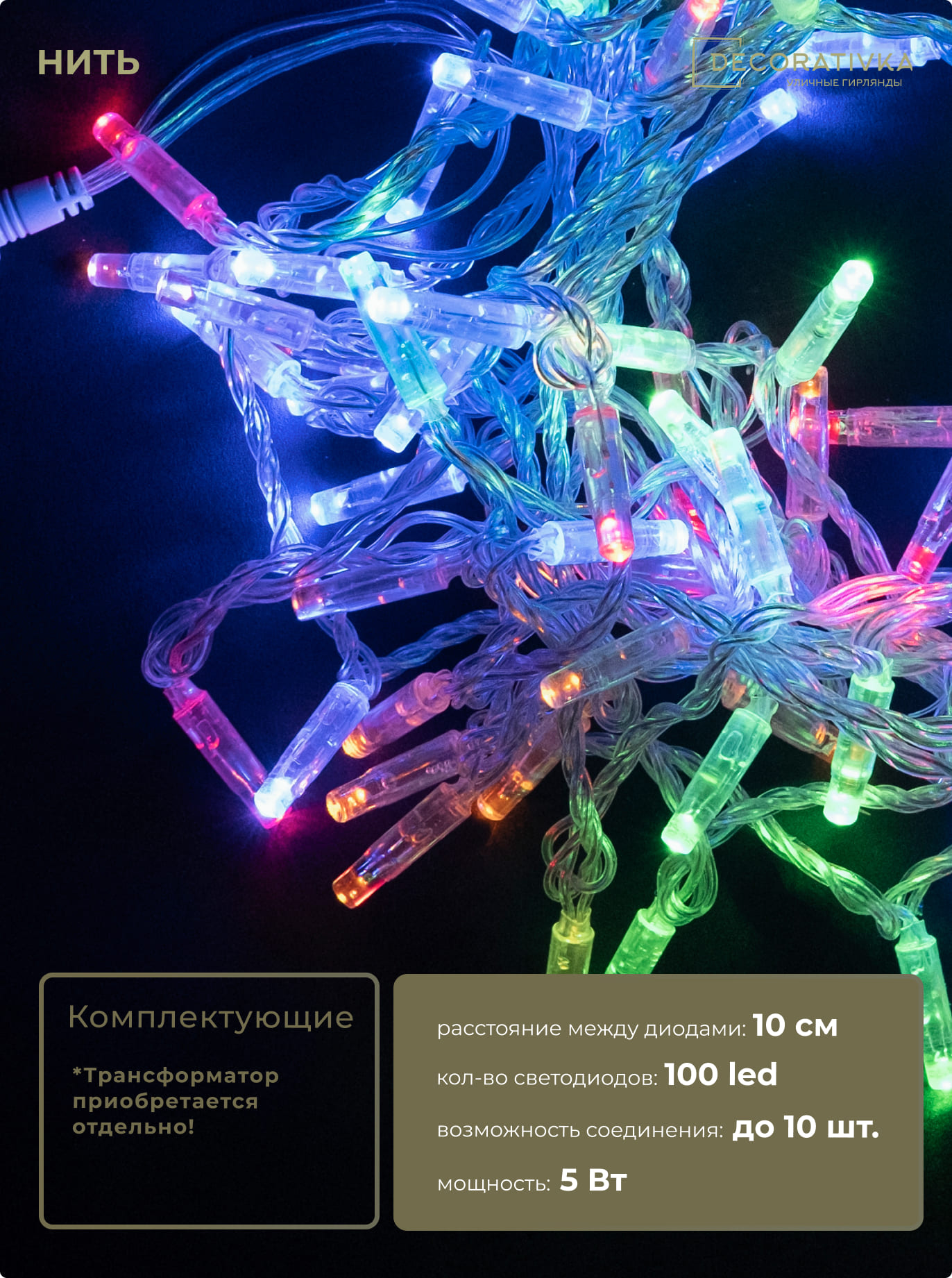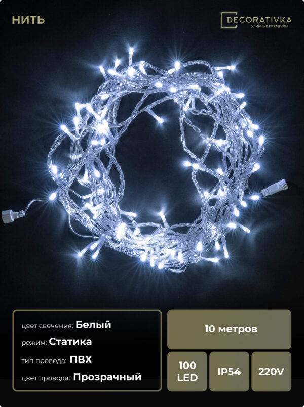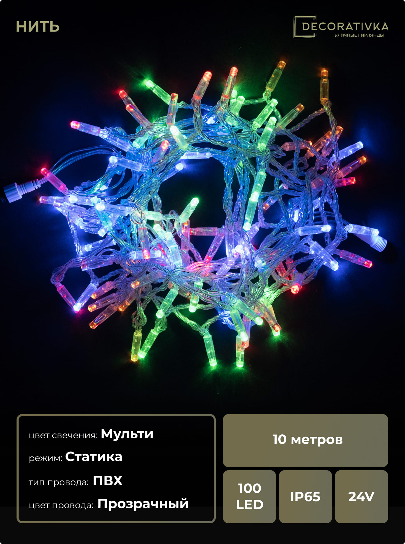 Гирлянда Нить с Колпачком 10м Разноцветная 24В, 100 LED, Провод Прозрачный ПВХ, IP65