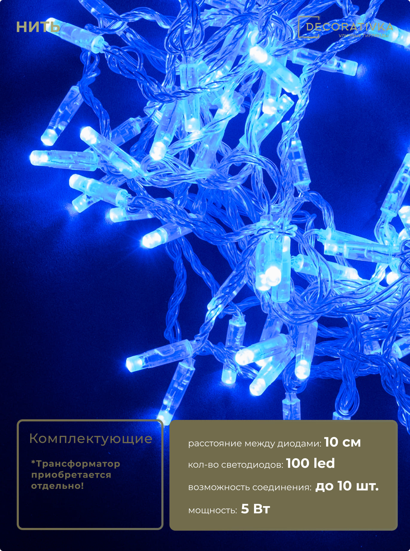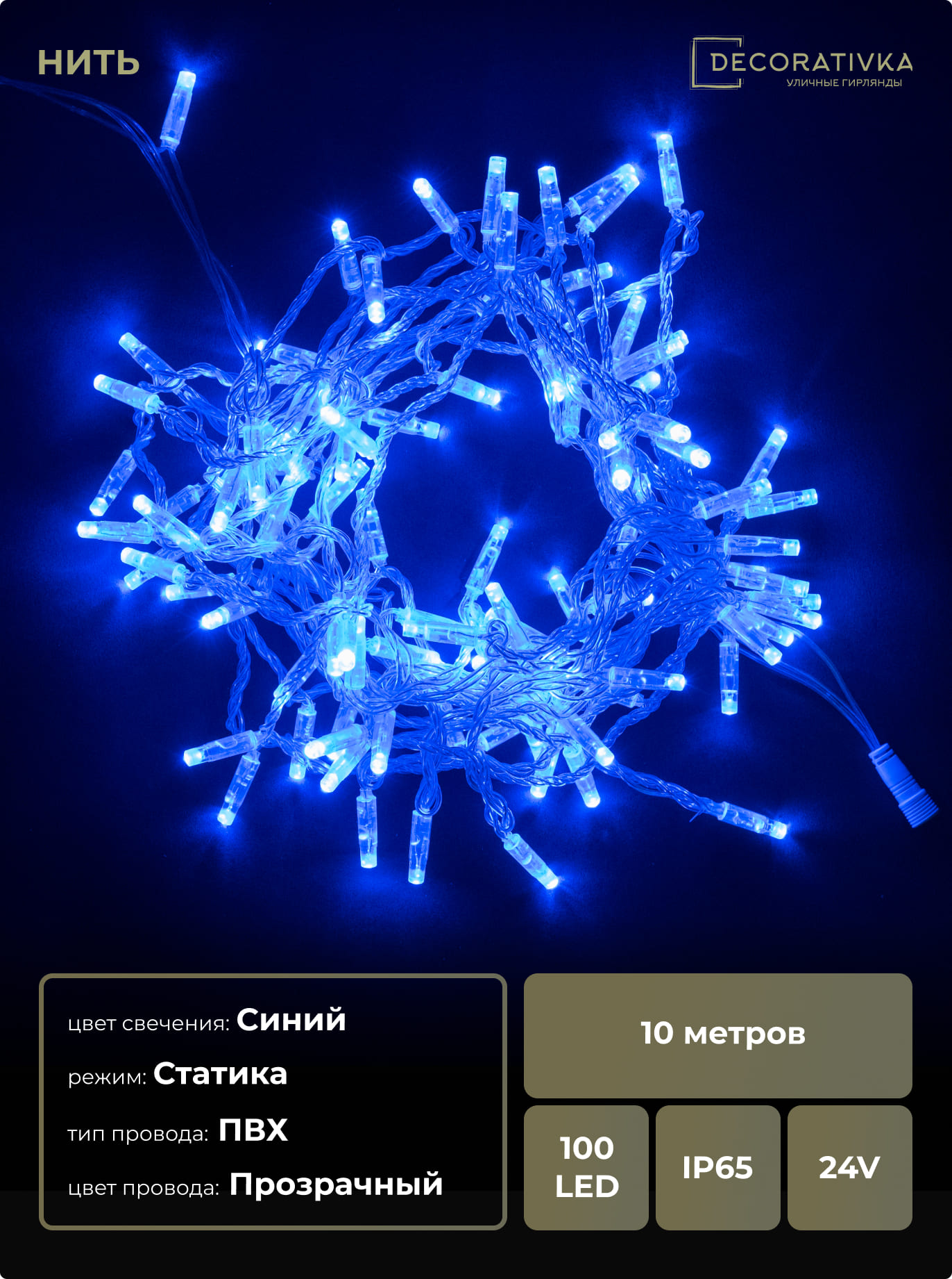 Гирлянда Нить с Колпачком 10м Синяя 24В, 100 LED, Провод Прозрачный ПВХ, IP65